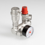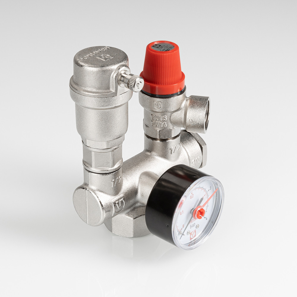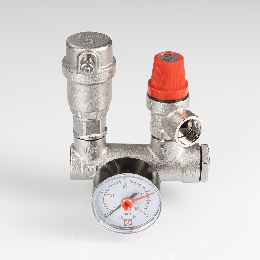 (VT.460.0) Комплектная группа безопасности для оснащения котлов и бойлеров систем автономного отопления, ГВС. Применяется в установках с тепловой мощностью до 44 кВт (определяется штатным предохранительным клапаном), номинальным давлением не выше 10 бар, рабочей температурой не более 120 °С. Допустимая рабочая среда – пар, вода, незамерзающий теплоноситель (максимальное содержание гликолей – 50 %). Состав изделия: предохранительный клапан (настройка – фиксированная, 3 бара), автоматический воздухоотводчик, манометр со шкалой 0–4 бар, латунный никелированный корпус. Предусмотрен резьбовой патрубок для подключения расширительного бака (диаметр – 3/4”). Группа безопасности котла монтируется на выходе теплогенератора. Резьба присоединения – внутренняя, 1”.