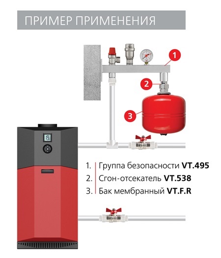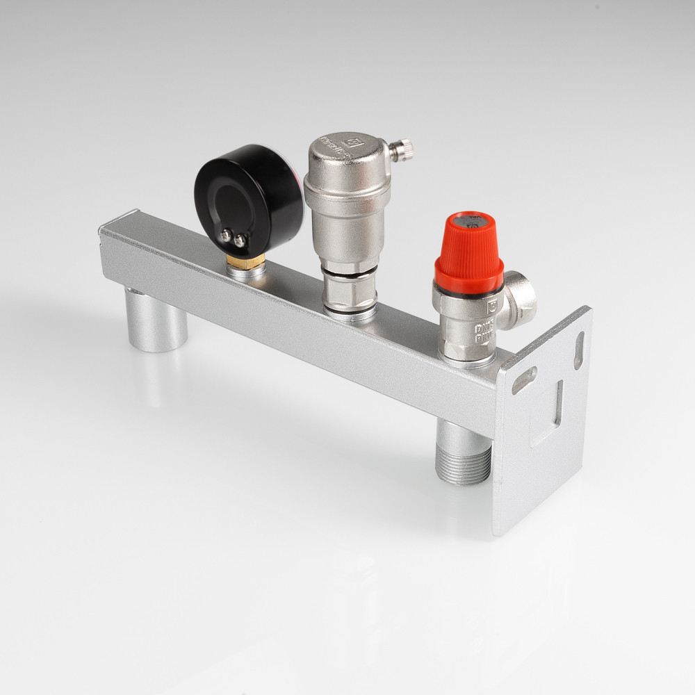 (VT.495.0) Группа безопасности стальная консольная (группа безопасности расширительного бака) представляет собой смонтированные на полой консоли из оцинкованной стали предохранительный клапан с фиксированной настойкой, автоматический воздухоотводчик, манометр со шкалой 0–4 бар. Консоль оборудована резьбовыми патрубками – присоединительным и для мембранного бака, фланцем настенного крепления. Непосредственно к группе допускается подвешивать «мембранник» объемом до 50 л. Оборудование рассчитано на применение в системах тепловой мощности до 44 кВт (увеличивается заменой предохранительного клапана); номинальное давлением – 10 бар; максимальная температура рабочей среды (вода, пар, незамерзающий теплоноситель с концентрацией гликоля не выше 50 %) – 120 °C. Функциями изделия являются защита системы отопления/ГВС от превышения давления, завоздушивания, индикация текущего значения давления, крепление мембранного бака.