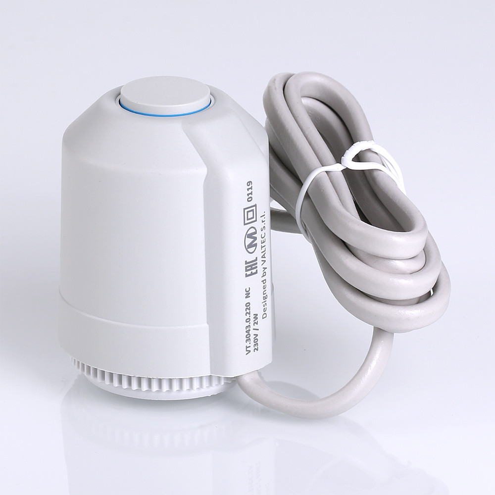 (VT.TE3043.0) Электротермический двухпозиционный сервопривод VT.TE3043 применяется для автоматического управления радиаторным или коллекторным термостатическим клапаном систем водяного отопления (в том числе теплого пола) и охлаждения зданий. Действие привода основано на расширении заполняющего сильфон армированного парафина при протекании электрического тока через встроенный нагревательный элемент по сигналу от комнатного термостата или контроллера.