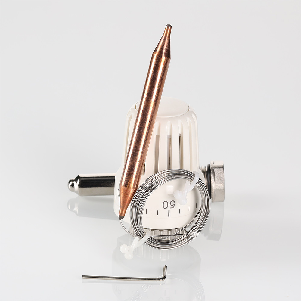 В комплекте с термоголовкой поставляется погружная гильза с наружной резьбой ½” и прижимным винтом.