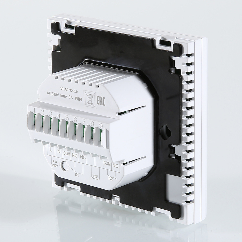 (VT.AC712.0) Хронотермостат электронный комнатный с Wi-Fi (Wi-Fi-хронотермостат) предназначен для подачи управляющего сигнала (включить/выключить) на регулирующие устройства водяного теплого пола или радиаторного отопления. Управление осуществляется в зависимости от температуры воздуха в помещении (встроенный датчик) и температуры пола (выносной датчик, входит в комплект). Возможны недельное программирование и выбор режима работы – по датчику температуры воздуха или датчику температуры пола.