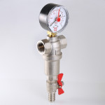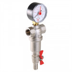 (VT.390.N) Компактный фильтр механической очистки воды с возможностью удаления накопившихся загрязнений без извлечения сетчатых вставок (промывной фильтр). Оснащен двумя (один в другом) фильтроэлементами из нержавеющей стали. Размер ячеек сетки первичного фильтроэлемента – 500, вторичного – 100 мкм. Корпус и колба фильтра выполнены из латуни марки CW617N (европейский стандарт EN 12165), никелированы. Предусмотрены дренажный шаровой кран со штуцером для подключения шланга и манометр для контроля уровня загрязненности сеток. Фильтр монтируется в вертикальном положении, колбой вниз. Резьба присоединений – внутренняя.