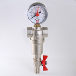 Корпус и колба фильтра выполнены из латуни марки CW617N (европейский стандарт EN 12165), никелированы. Предусмотрены дренажный шаровой кран со штуцером для подключения шланга и манометр для контроля уровня загрязненности сеток. Фильтр монтируется в вертикальном положении, колбой вниз. Резьба присоединений – внутренняя.