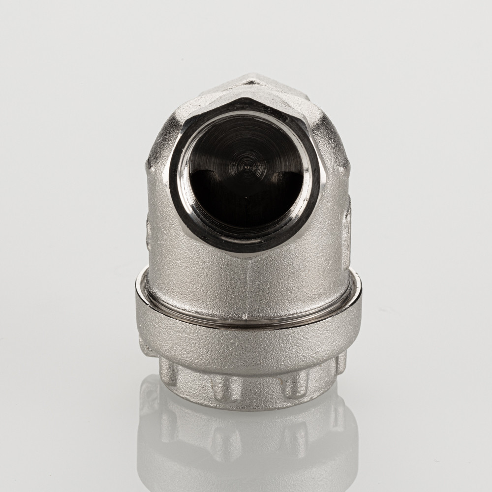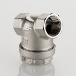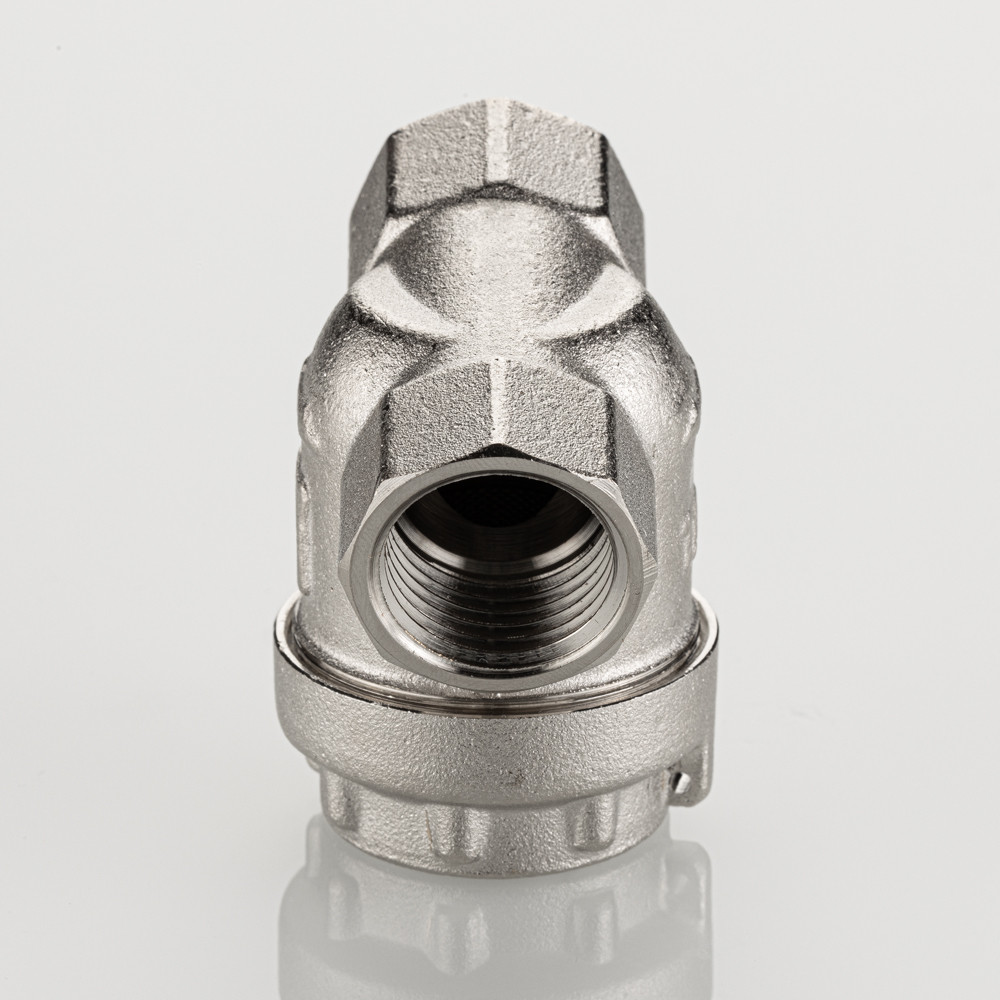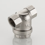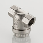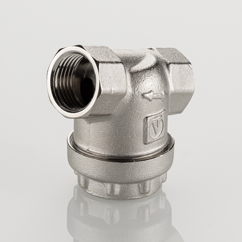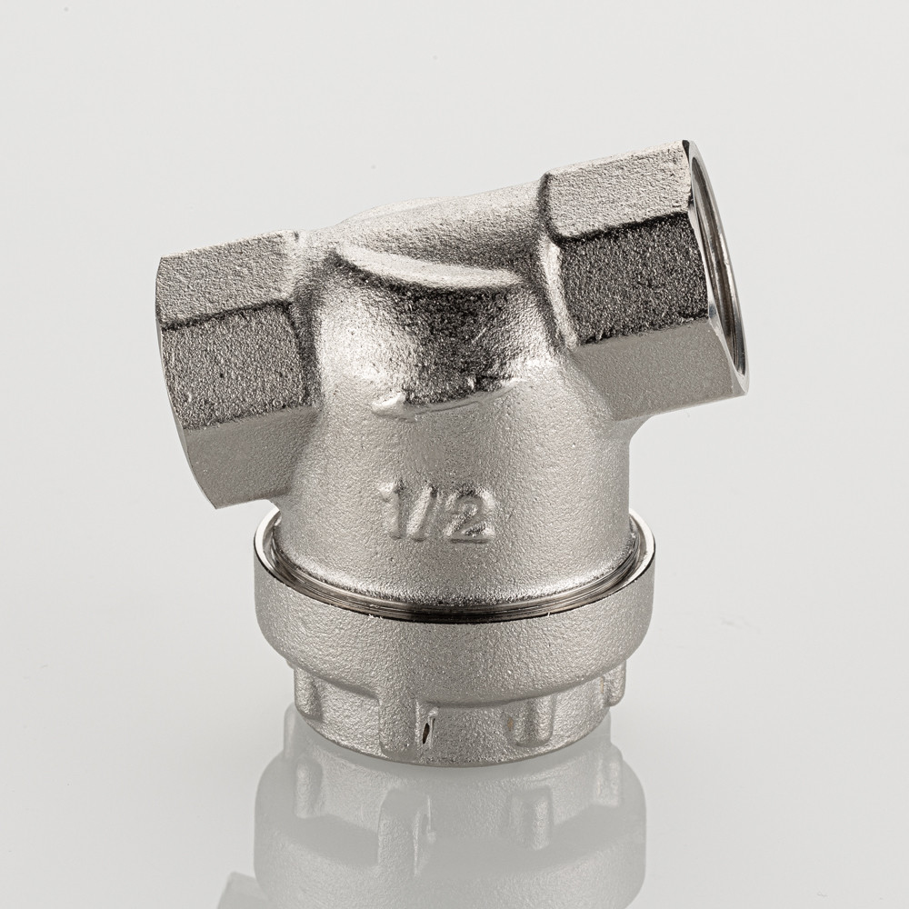(VT.386.N) Универсальный фильтр механической очистки. Направление движения жидкости – любое. Благодаря колбе, повернутой навстречу потоку, пригоден для установки на вертикальных участках трубопровода при движении потока снизу–вверх. Корпус и пробка фильтра выполнены из латуни марки CW617N (европейский стандарт EN 12165), никелированы. Между ними имеется прокладка из EPDM. Пробка оснащена отверстием для пломбировки. Размер задерживаемых частиц – от 300 мкм. Максимальная рабочая температура фильтруемой среды – 110 °C. Максимальное рабочее давление – 16 бар. Резьба присоединения – внутренняя, 1/2".