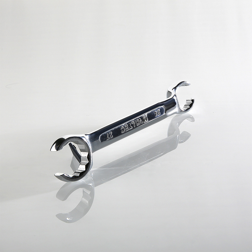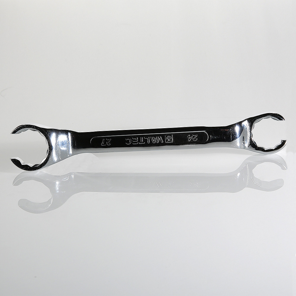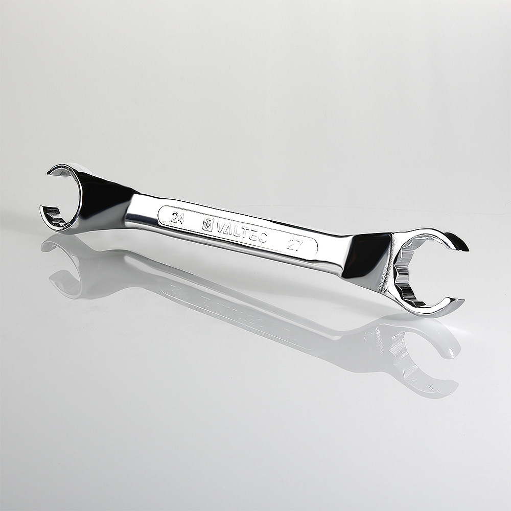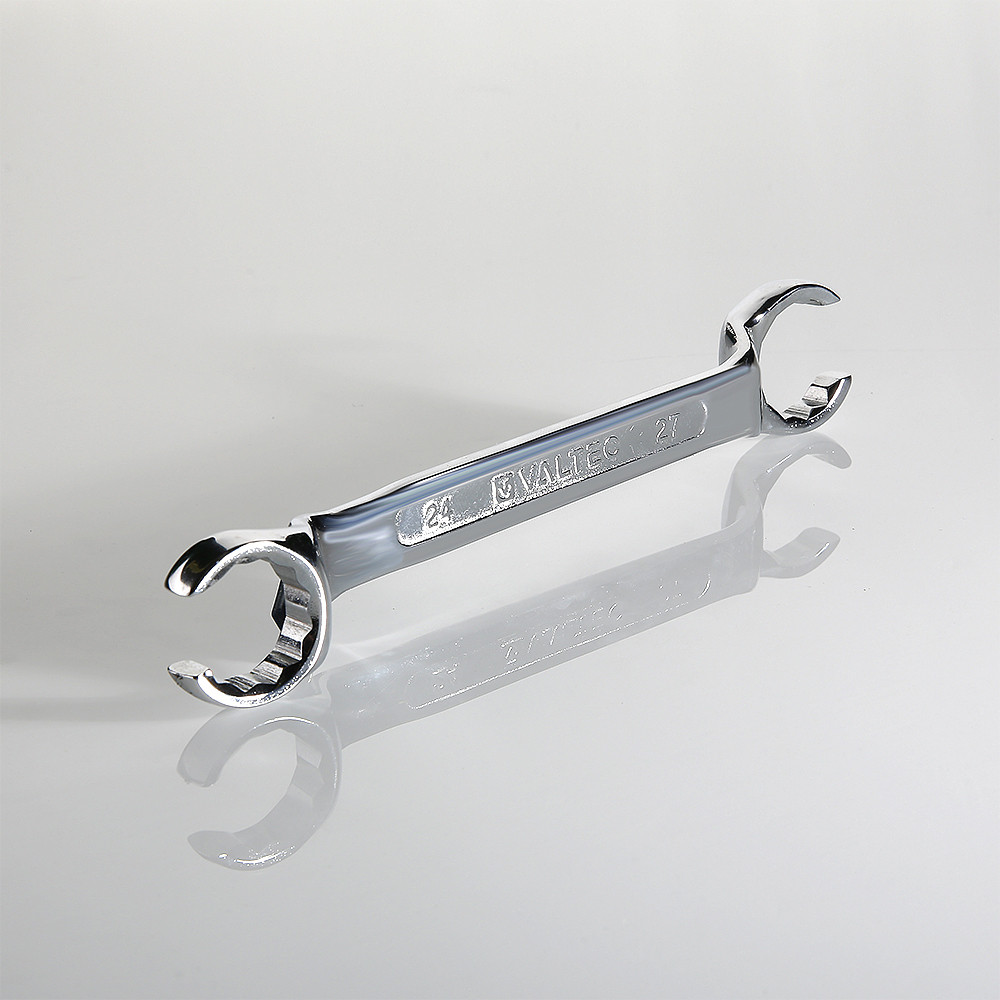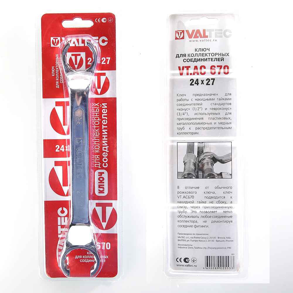 (VT.AC670.0) Ключ для коллекторных фитингов – инструмент, значительно облегчающий подключение трубных петель к коллекторам, особенно необходимый монтажникам систем водяного теплого пола, которым часто приходится монтировать оборудование в стесненном пространстве распределительного шкафа. Головки ключа имеют разрезы, через которые удобно продеть присоединенную трубу, предварительно наживив накидную гайку соединителя на отвод коллектора. Конфигурация головки позволяет плотно охватить гайку и произвести ее затяжку. Ключ – двухсторонний, обеспечивает монтаж/демонтаж фитингов стандартов «конус» (1/2”), «евроконус» (3/4”).