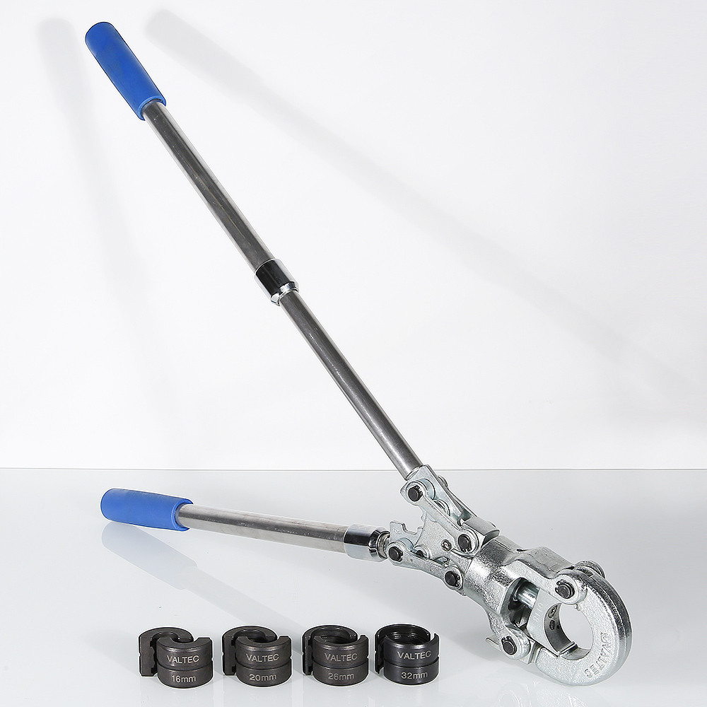 (VTm.293.0) Радиальные клещи для ручного обжатия пресс-фитингов трубопроводных систем из полимерных и металлополимерных труб. Усилие обжатия зависит от длины телескопических рукояток и регулируется также механизмом пресс-головки, которая, кроме того, может поворачиваться относительно рукояток на 360°. Масса пресс-инструмента без насадок – 3,1 кг. Клещи комплектуются насадками с профилем ТН, предназначенными для монтажа пресс-фитингов VALTEC диаметром 16, 20, 26, 32 мм.
