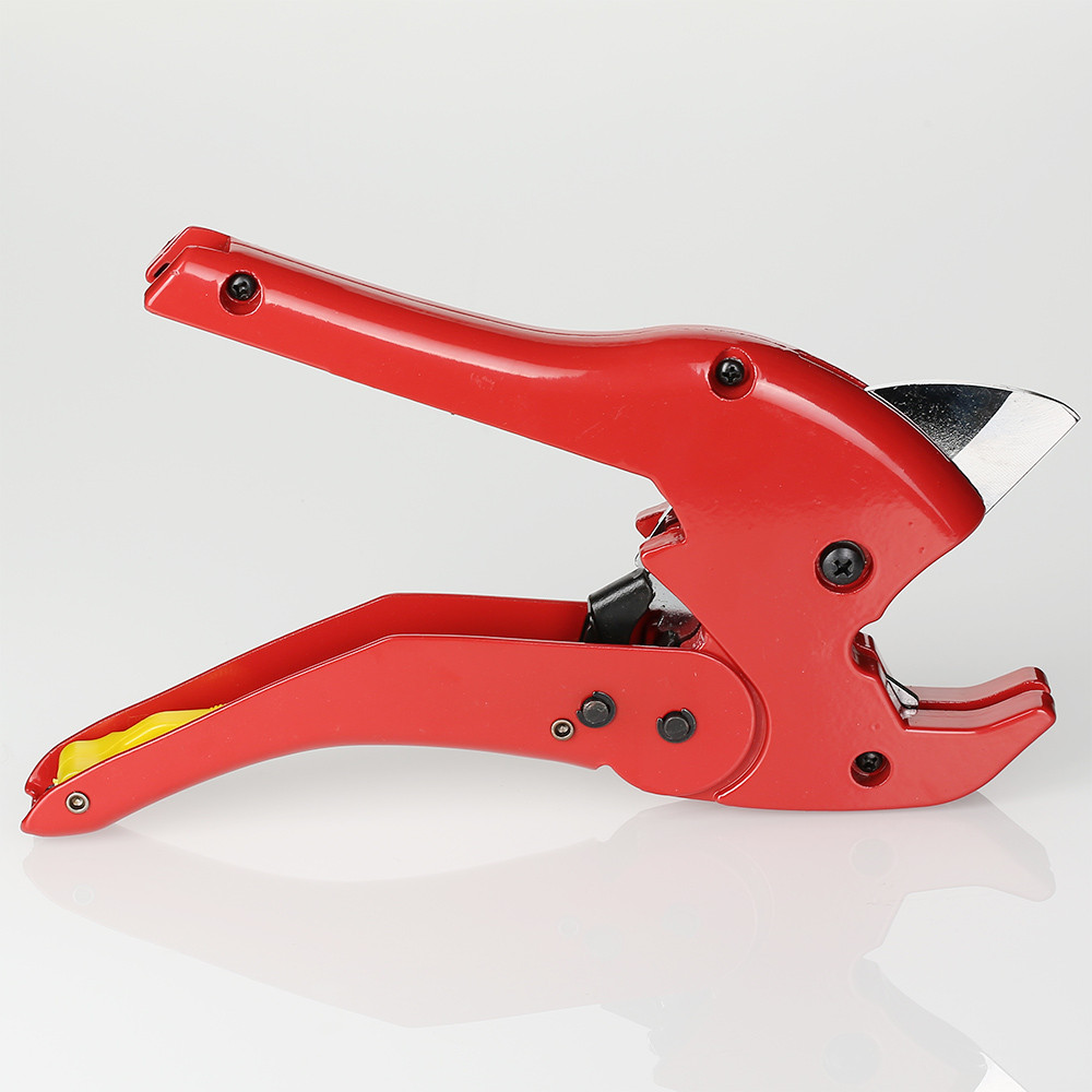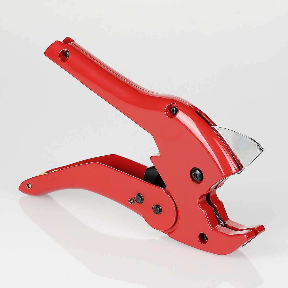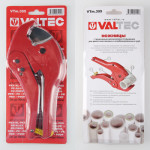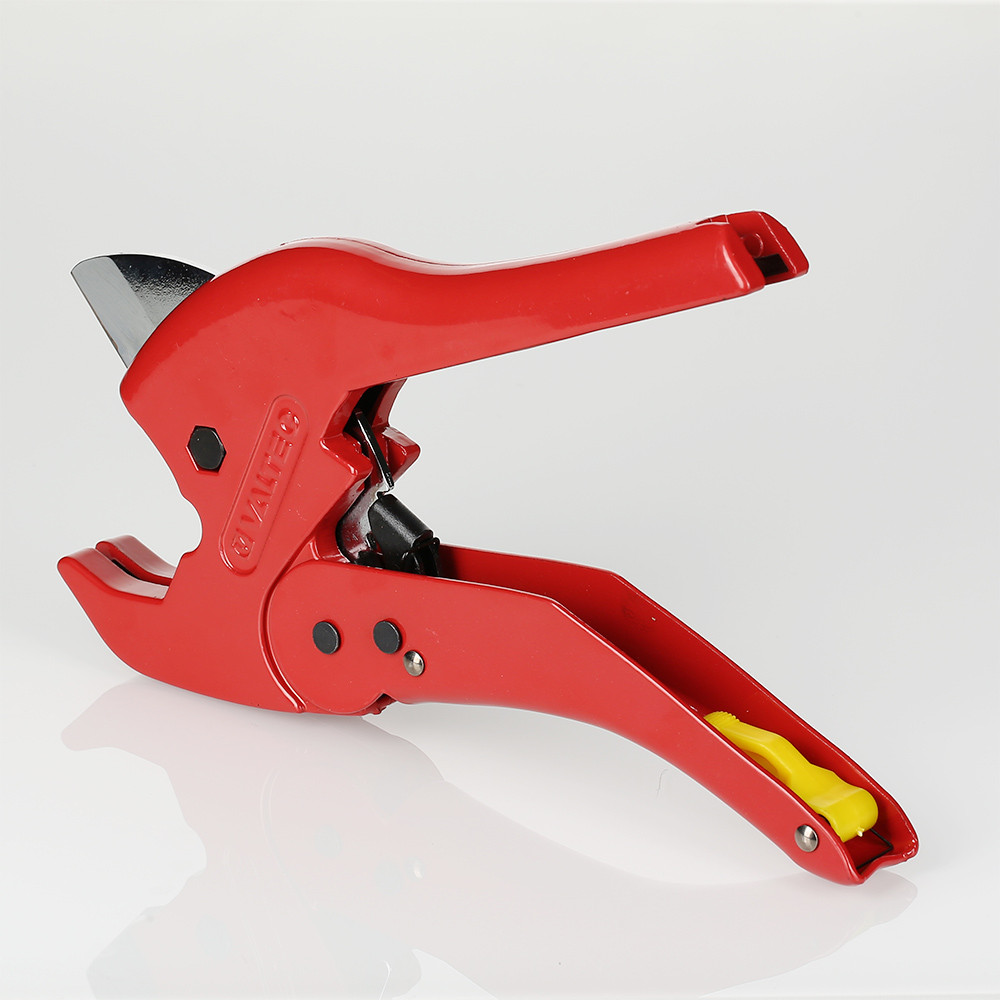 (VTm.395.0) Ножницы с храповым механизмом для металлополимерных и пластиковых труб (до 40 мм). Обеспечивают разрезание под прямым углом труб указанного диаметра. Конструкция инструмента включает в себя нож из нержавеющей стали, храповой механизм, подпружиненную защелку, фиксирующую ножницы в закрытом положении. Внутри рукоятки расположена пружина, поднимающая нож.