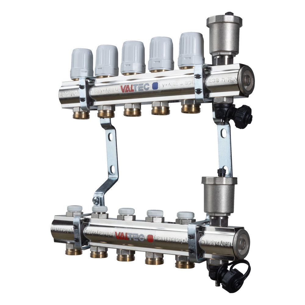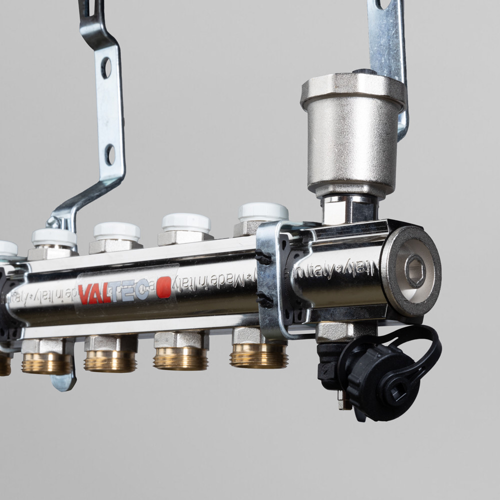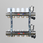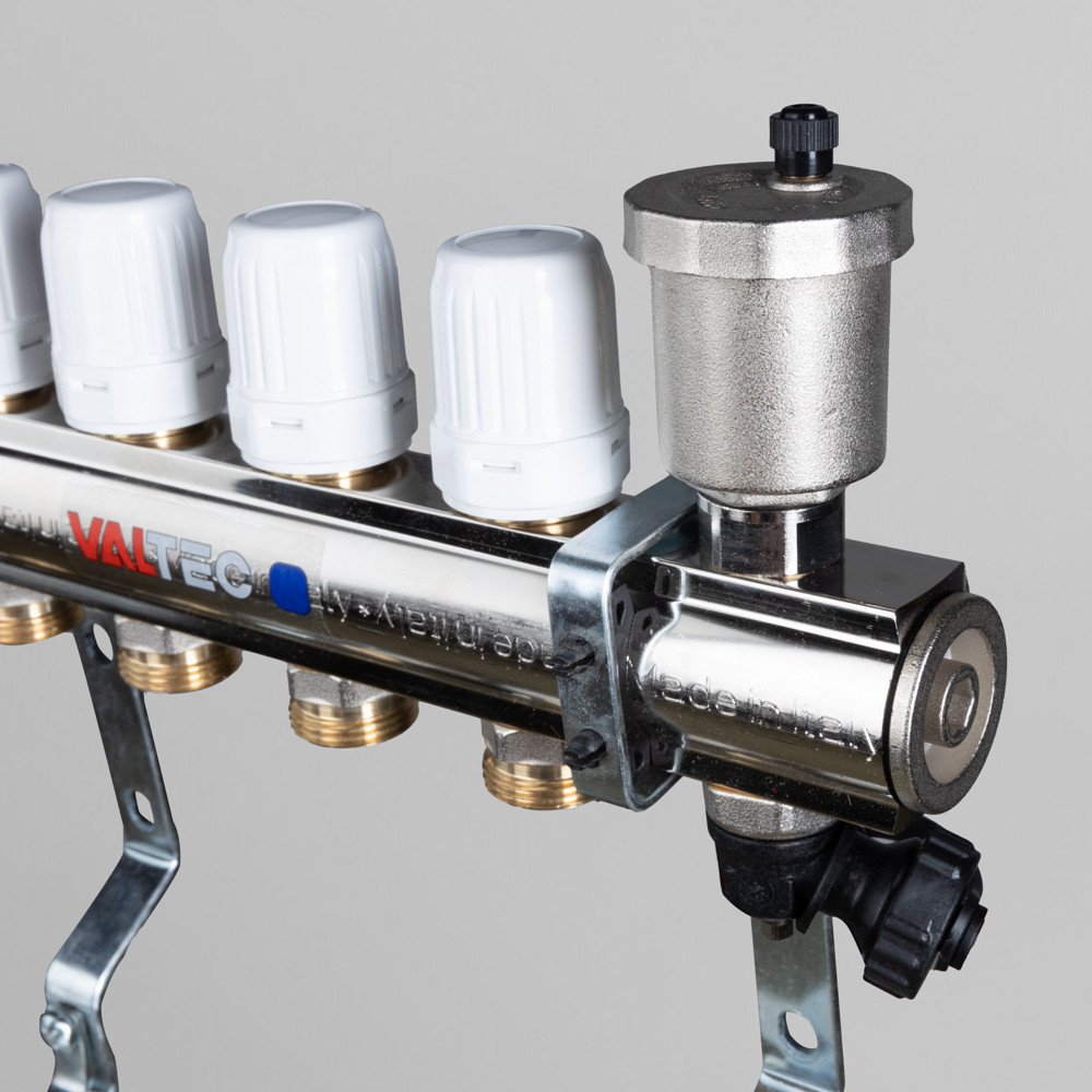 (VTc.594.EMNX) Коллекторный блок для систем водяного радиаторного и напольного отопления (водяной теплый пол) с настроечными (ручными балансировочными) и регулирующими (с возможностью установки электротермического сервопривода) клапанами, автоматическими воздухоотводчиками и дренажем.