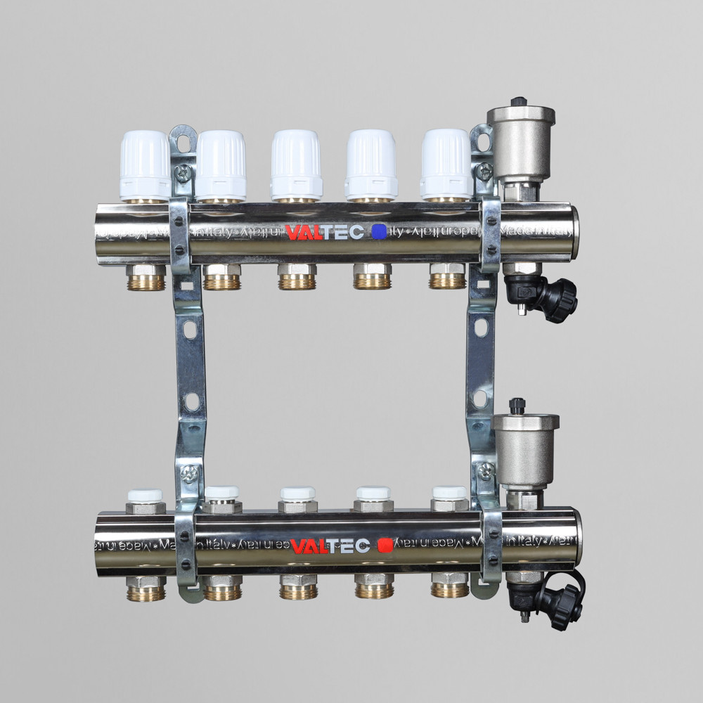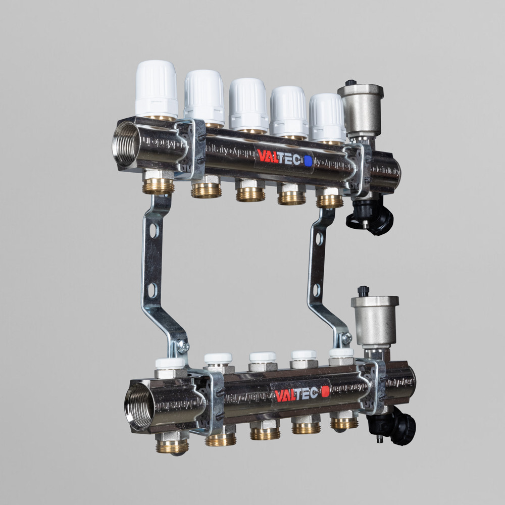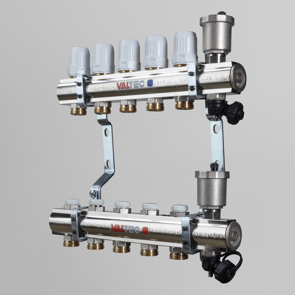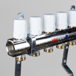 Диаметр коллекторов – 1 или 1 1/4". Число выходов – от 3 до 12. Диаметр патрубков – 3/4", резьба – наружная, стандарт присоединения – «евроконус». Рабочая температура теплоносителя – до 120 °С, давление – до 10 бар.
