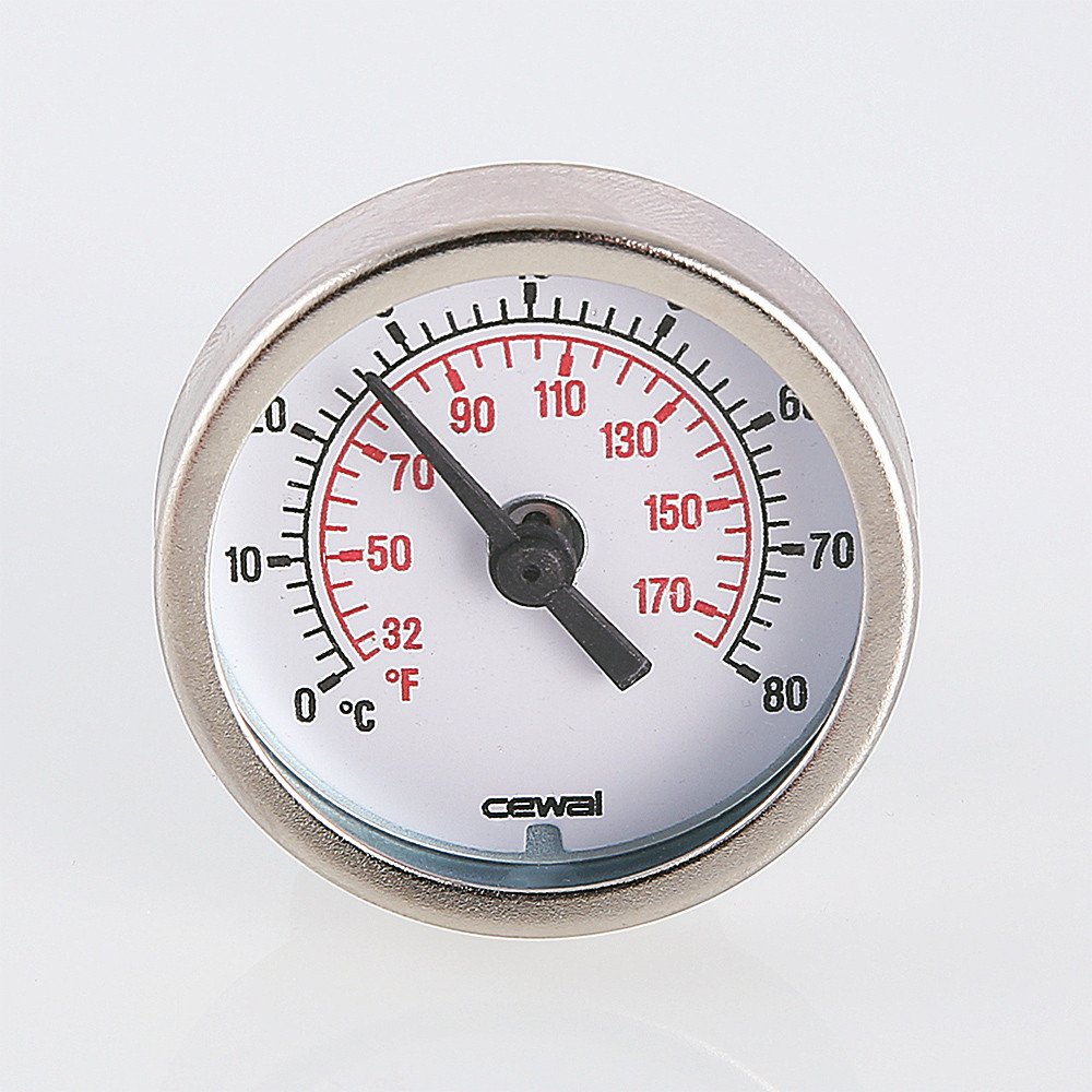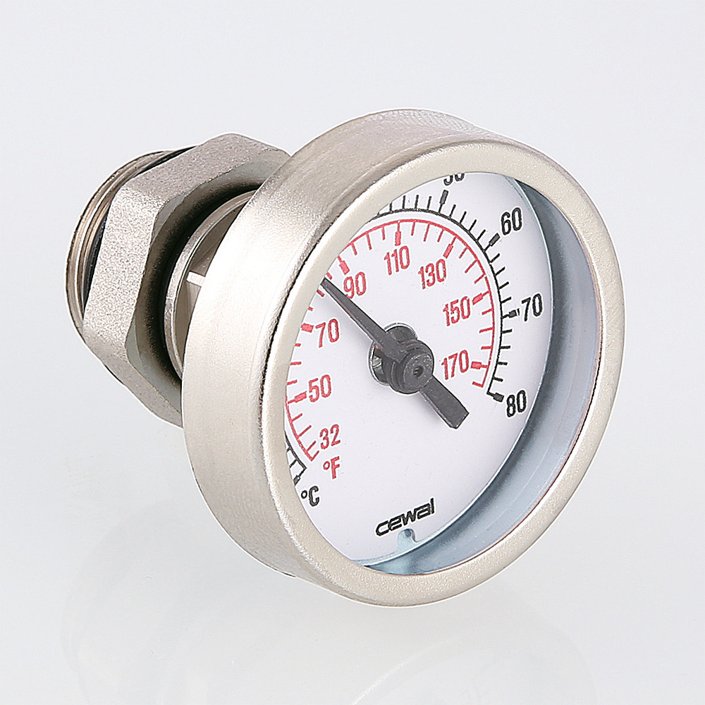 (VT.0617.0) Термометр погружной предназначен для контроля текущей температуры теплоносителя в контурах теплого пола (место установки – коллекторные блоки, насосно-смесительные узлы), других систем водяного отопления либо охлаждения. Диапазон значений измеряемой величины – 0–80 °C. Класс точности прибора – 2. Диаметр циферблата – 41 мм. Материал корпуса термометра – оцинкованная сталь. Термометр имеет тыльное подключение, комплектуется выполненной из латуни CW614N погружной гильзой с наружной присоединительной резьбой 1/2" и уплотнением из EPDM, монтируемой с помощью гаечного ключа. Максимальное рабочее давление в обслуживаемой системе – 10 бар.