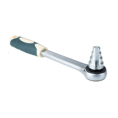 (AKEY0407RF) Сгонный ступенчатый ключ для монтажа стальных, чугунных, латунных и бронзовых резьбовых фитингов типа «американка» с монтажными наплывами на внутренней поверхности. Ключ оснащен длинной рукояткой и трещоткой. Диапазон диаметров – от 1/2 до 1 1/4”.