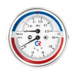 (TMTБ-31T) Прибор предназначен для одновременного измерения избыточного давления и температуры воды и других сред, неагрессивных к сплавам меди. Он представляет собой объединенные в одном корпусе деформационный манометр и биметаллический термометр. Для снятия показаний предусмотрены две шкалы – давления и температуры. Комплектуется клапаном, позволяющим демонтировать термоманометр без разгерметизации системы. Класс точности – 2,5. Диаметр корпуса – 80 мм. Диапазон измеряемых температур – от 0 до 120 или 150 °С, давления – от 0 до 6 или 10 бар. Присоединение – осевое (заднее). Диаметр присоединения – 1/2".