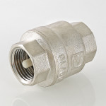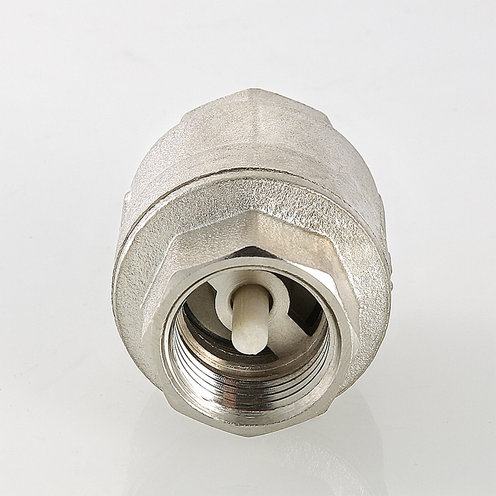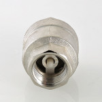 (VT.161.N) Пружинный обратный клапан с золотниковым механизмом (шток, верхняя, нижняя тарелки) из нейлона (стеклонаполненный полиамид), отличающегося механической, термической, химической стойкостью. Материал пружины – нержавеющая сталь AISI 306. Корпус изделия изготовлен способом объемного горячего штампования из высококачественной латуни CW617N (евростандарт EN12165) с нанесением гальванопокрытия (никелирование). Диапазон рабочих температур: –20… +90 °С. Номинальное давление – 25–40 бар (зависит от типоразмера). Резьба присоединения – внутренняя. Направление потока указано стрелкой на корпусе. Данный обратный клапан монтируется в любом положении, трущиеся поверхности отсутствуют.