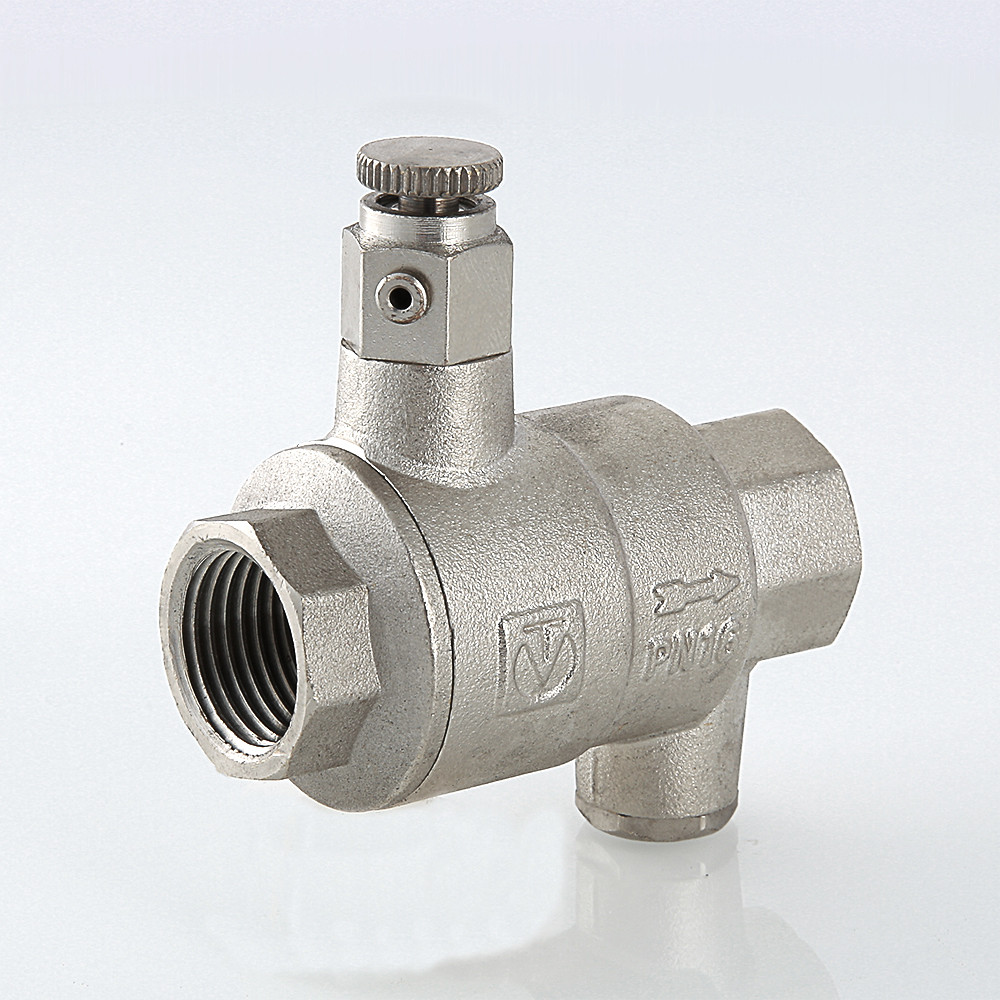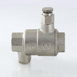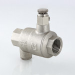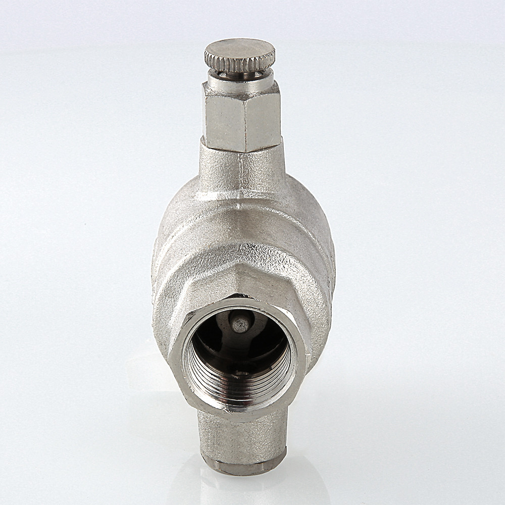(VT.171.N) Обратный клапан с дренажем и воздухоотводчиком – комбинированное устройство с функциями защиты от обратного движения рабочей среды, слива воды после клапана, удаления воздушных пробок при вертикальной установке арматуры. Ручной воздухоотводчик и дренажная пробка (входят в комплект) вкручиваются в патрубки с внутренней резьбой диаметром 1/4". При горизонтальном монтаже клапана воздухоотводчик не требуется, вместо него можно установить манометр. Материал корпуса изделия – латунь CW617N с никелевым гальванопокрытием, штока, тарелки золотника – ABS-пластик, золотникового уплотнения – EPDM, пружины – нержавеющая сталь марки AISI 316. Устройство рассчитано на эксплуатацию при температуре рабочей среды от –20 до +90 °С. Минимальный перепад давлений открытия – 0,025, закрытия – 0,05 бара.