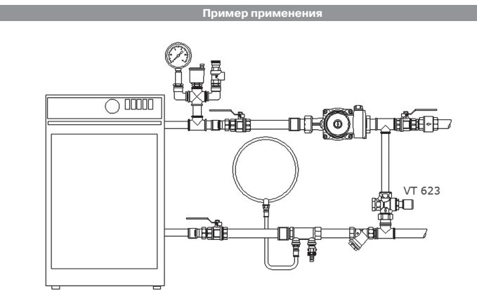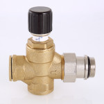 (VT.623.G) Перепускной клапан для систем водяного отопления. Клапан обеспечивает, в частности, постоянство расхода теплоносителя во вторичном контуре системы напольного отопления с насосно-смесительным узлом независимо от расхода в петлях теплого пола. При превышении настроечного перепада давлений клапан направляет часть потока в байпас насосно-смесительного узла. Применение перепускного клапана защищает насос от работы «на закрытую задвижку», дает возможность сохранять циркуляцию теплоносителя даже при полностью перекрытых коллекторных петлях. Диапазон настроек перепада давления клапана – от 20 до 60 кПа. Корпус клапана выполнен из латуни марки CW617N, пружина – из нержавеющей стали. Материал уплотнений и золотника клапана – эластомер NBR. Настройка клапана осуществляется с помощью пластиковой ручки. Максимальная рабочая температура теплоносителя – 120 °C, номинальное рабочее давление – 10 бар.