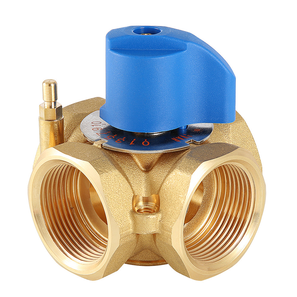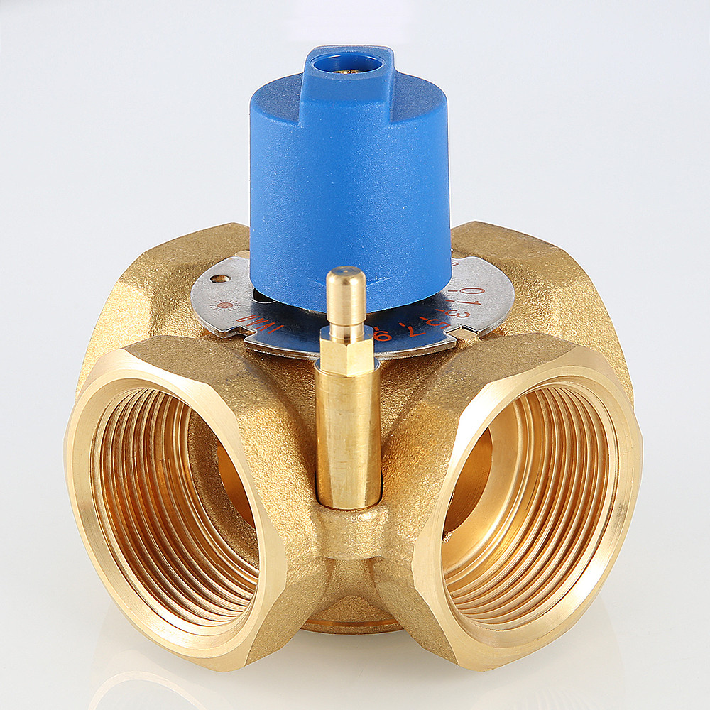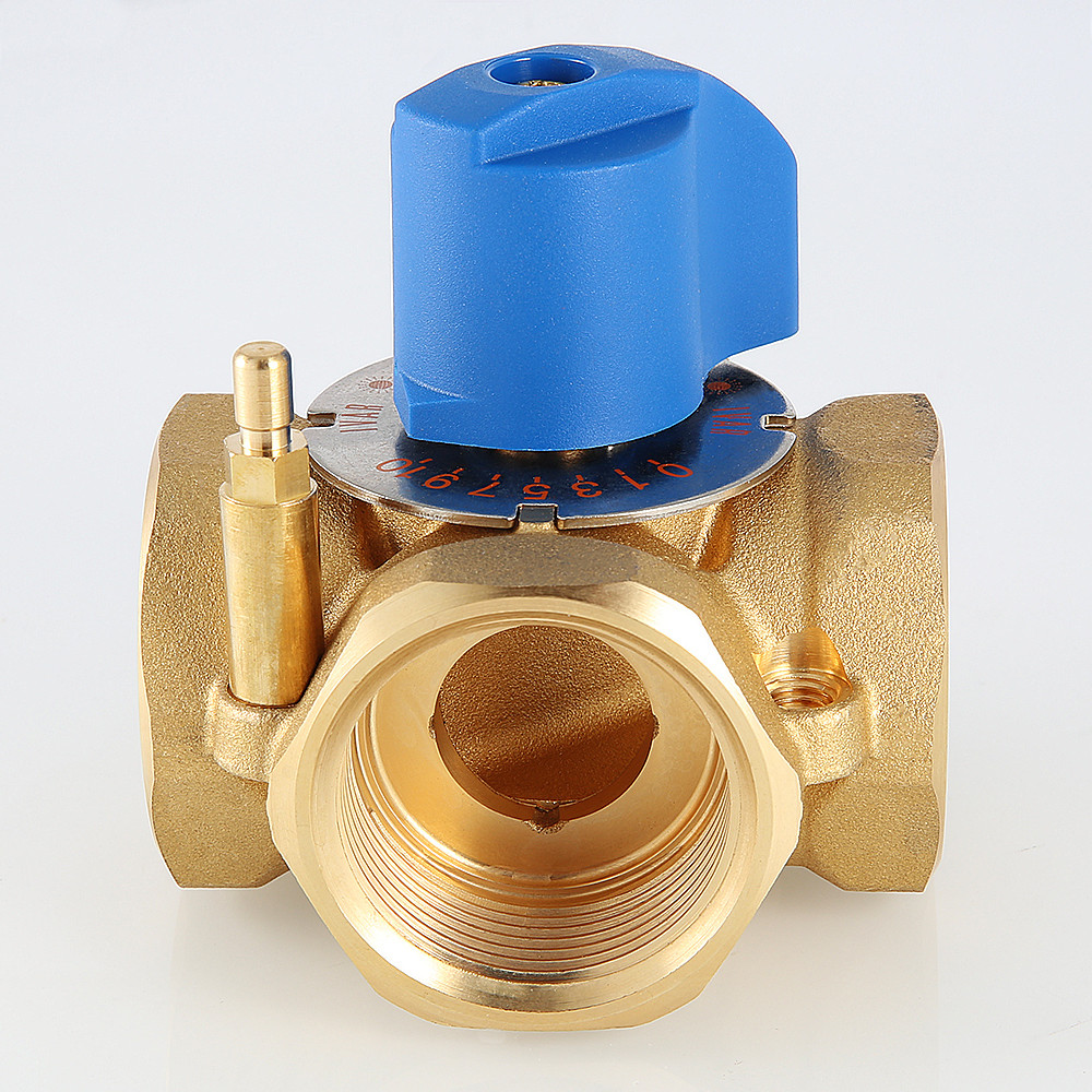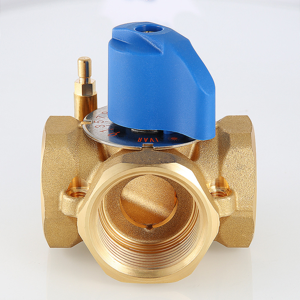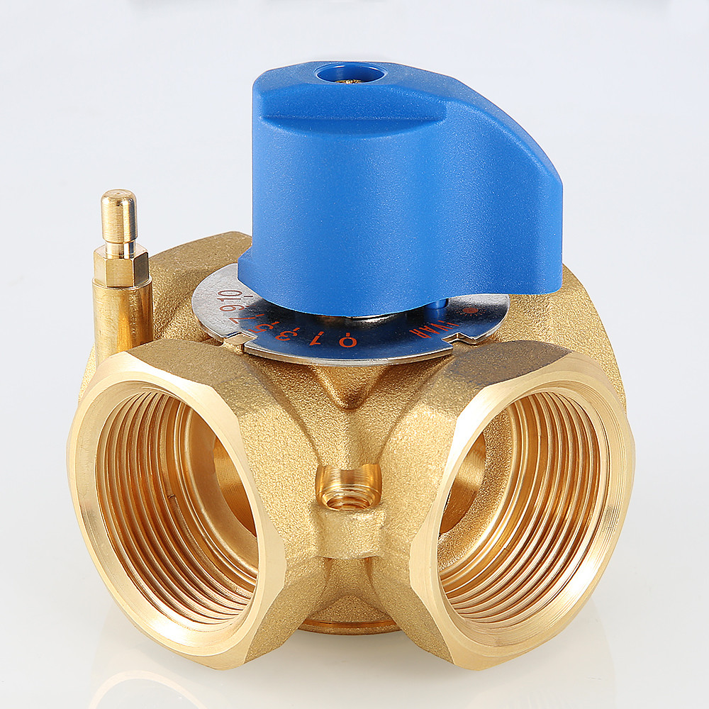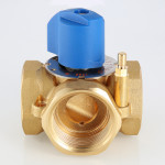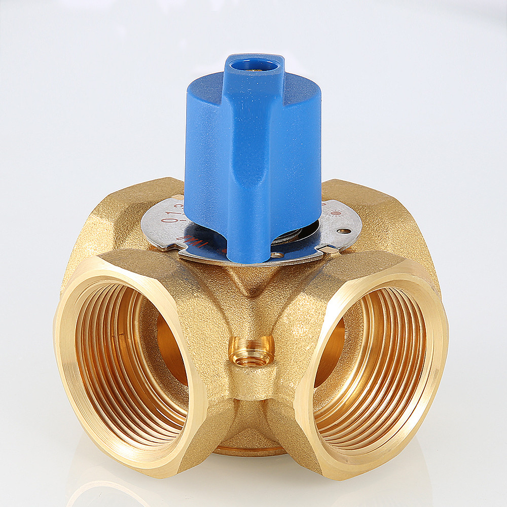 (VT.MIX04.G) Предназначен для использования в смесительных и разделительных узлах гидравлических систем. Управление клапаном может осуществляться вручную или с помощью сервопривода с крутящим моментом не менее 5 Н•м (рекомендуется модель VT M 106). Корпус и регулирующий элемент выполнены из латуни, что исключает возможность появления коррозионных отложений в рабочих зазорах. Уплотнение штока достигается с помощью двух колец из синтетического каучука EPDM PEROX. При этом верхнее кольцо легко заменить без полной разборки изделия. Клапан ремонтопригоден и состоит всего из четырех основных деталей, что повышает его надежность. Максимальная рабочая температура теплоносителя – 120 °C, нормативное давление – 10 бар. Резьба присоединений – внутренняя. Условные диаметры предлагаемых моделей – 3/4, 1, 1 1/4". Ручка управления входит в комплект.