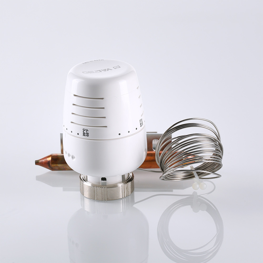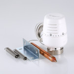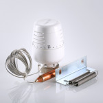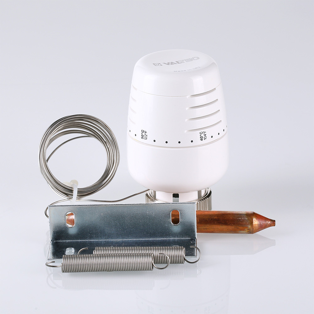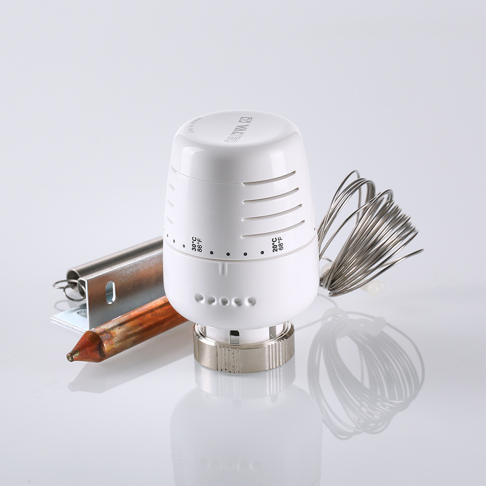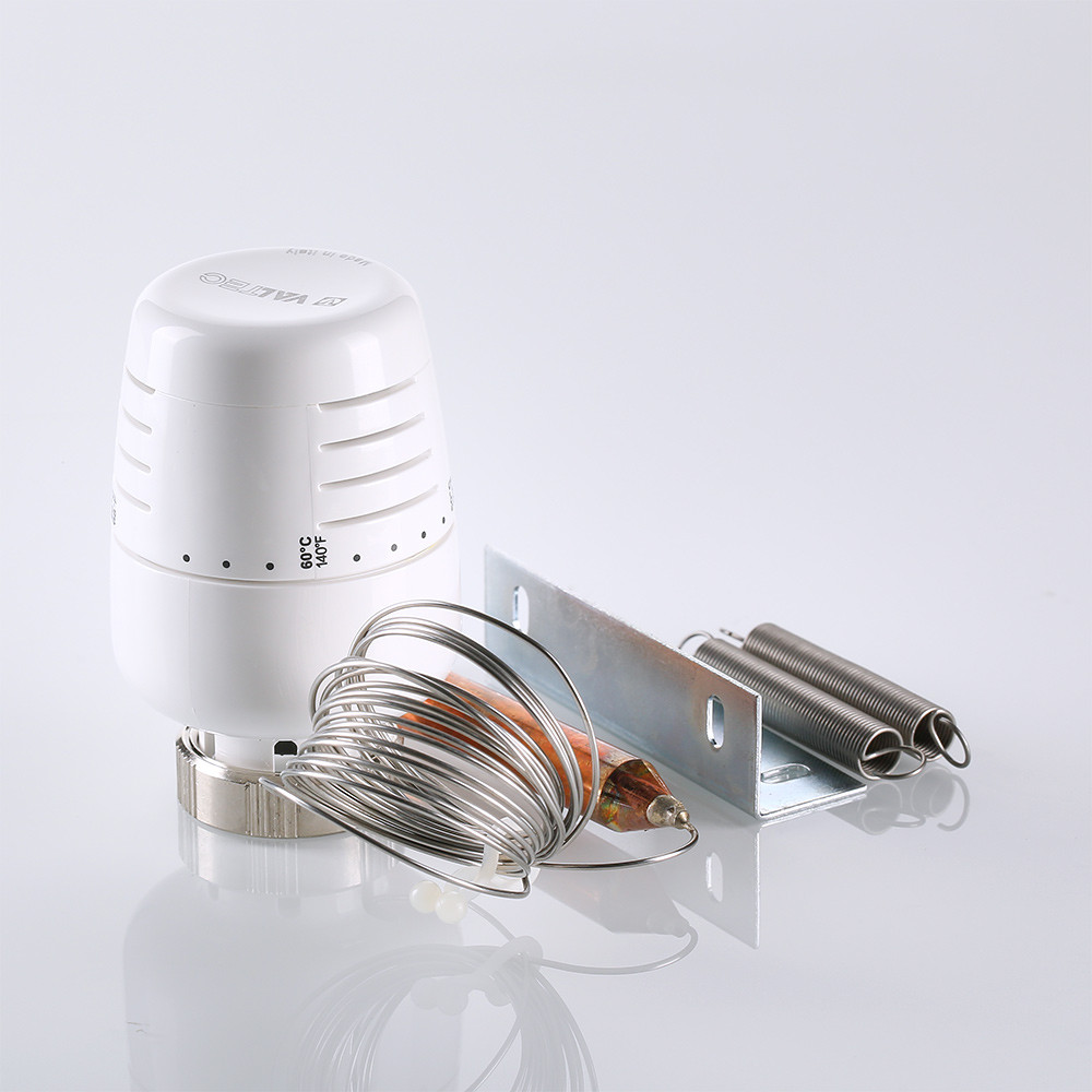 (VT.5012.0) Термостатическая головка, соединенная медной капиллярной трубкой длиной 2 м с выносным накладным датчиком температуры. Диапазон регулирования – от 20 до 60 °C. Головка применяется для управления термостатическим клапаном в составе насосно-смесительных узлов напольного отопления (теплый пол). Датчик монтируется на трубопроводе с помощью ложемента и хомутов.