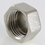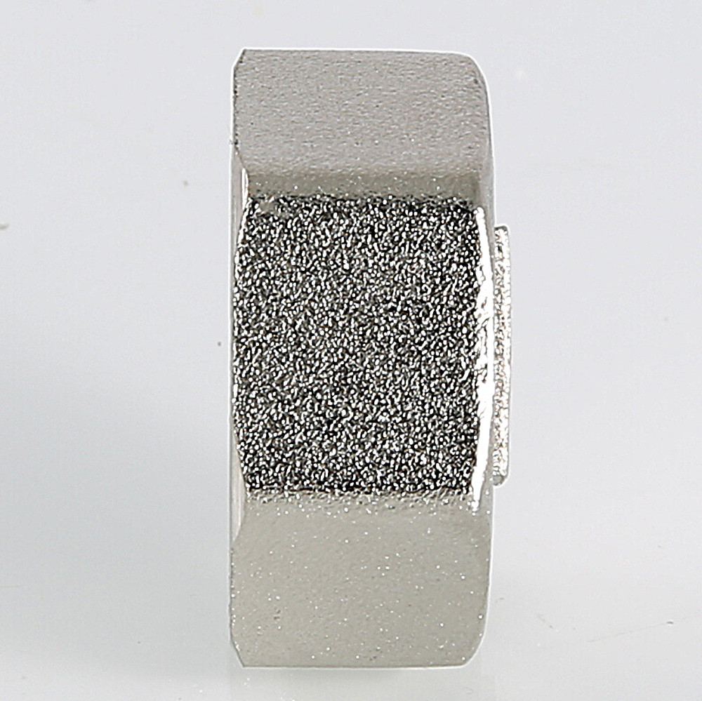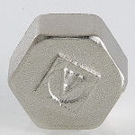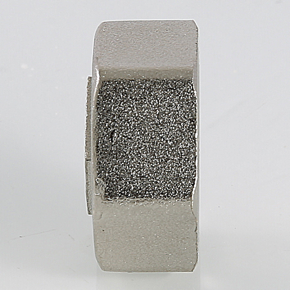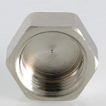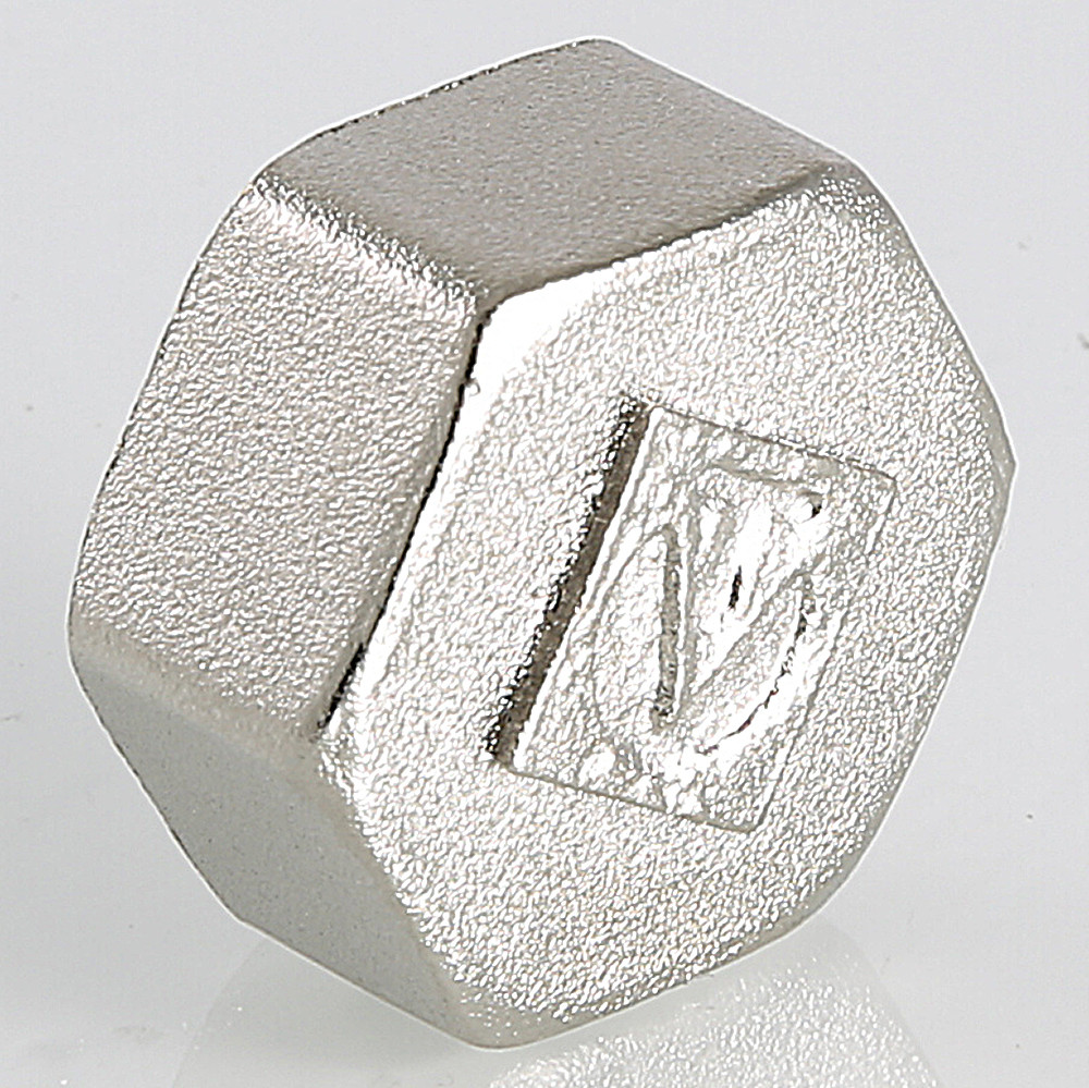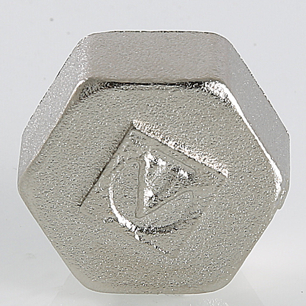 (VTr.590.N) Латунная никелированная трубопроводная заглушка с шестигранной головкой. Имеет внутреннюю трубную цилиндрическую резьбу по ГОСТу 6357 (ISO 228, EN 10226), совместимую также с наружной конической трубной резьбой по ГОСТу 6211 (ISO R7).
