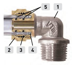 Конструкция обжимного фитинга VALTEC: 1 – корпус (латунь CW617N); 2 – гайка (латунь CW617N); 3 – обжимное кольцо (латунь); 4 – диэлектрическая прокладка (тефлон); 5 – кольца (EPDM Sh70).