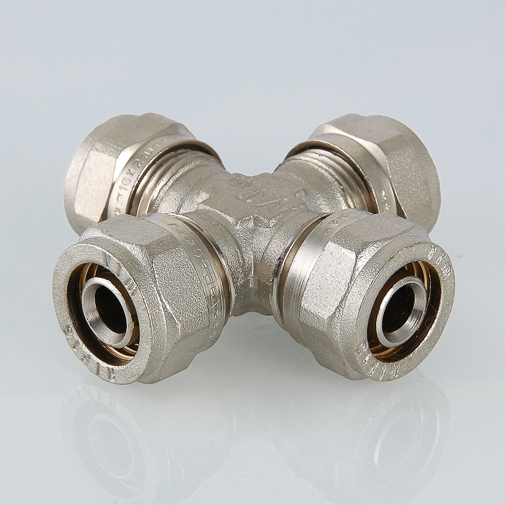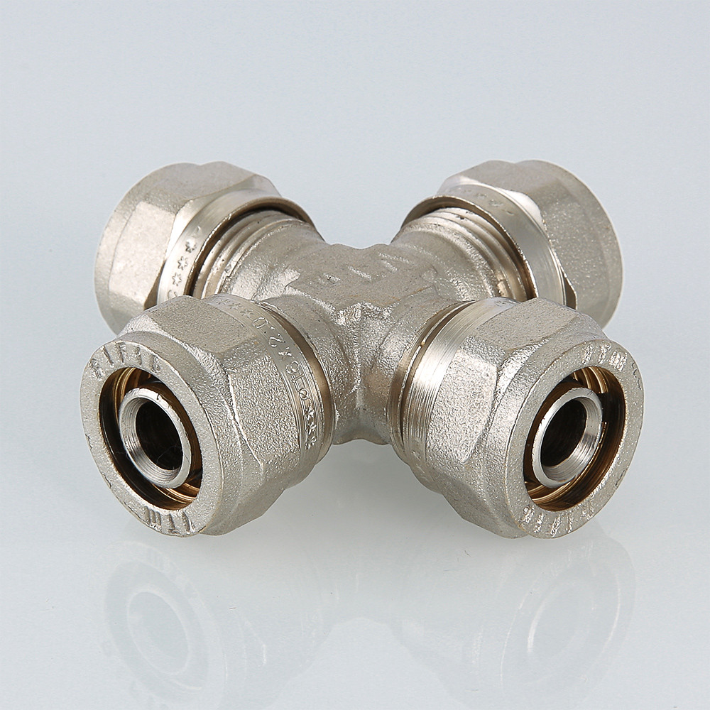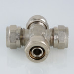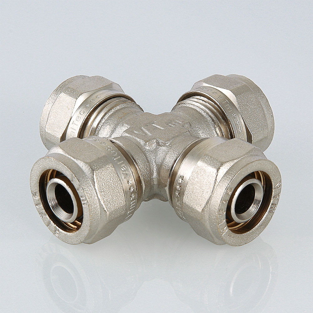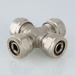(VTm.341.N) Фитинг обжимной крестовина для присоединения металлополимерных (металлопластиковых) трубопроводов. Предлагаются как равнопроходные модели, так и крестовины с разными диаметрами присоединяемых трубопроводов.