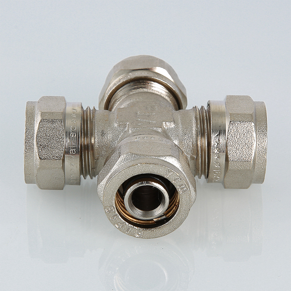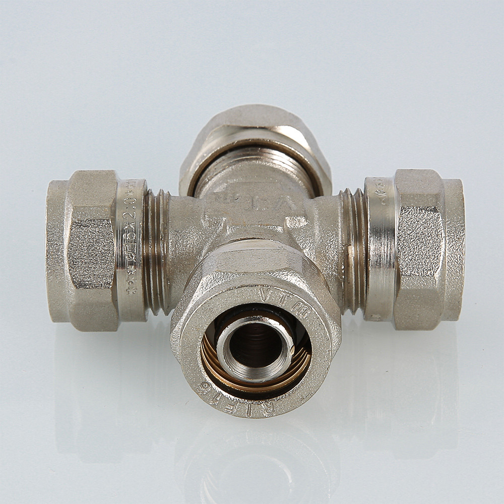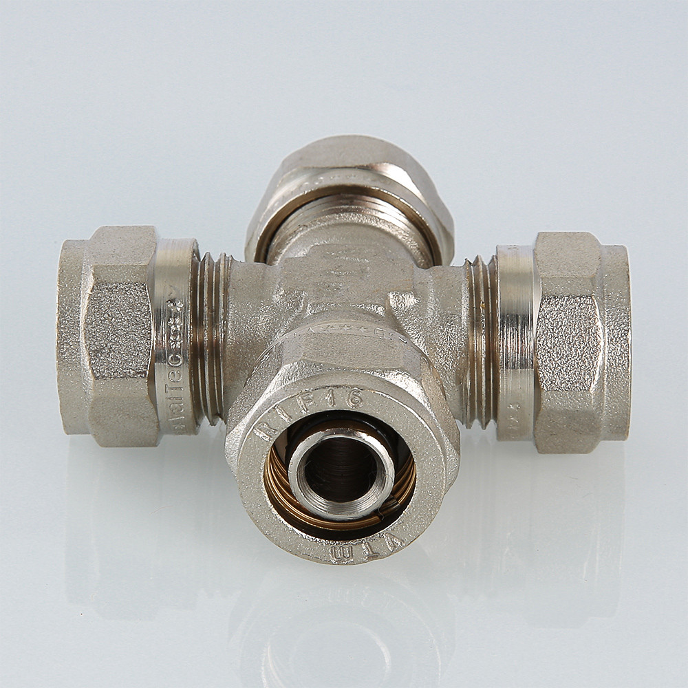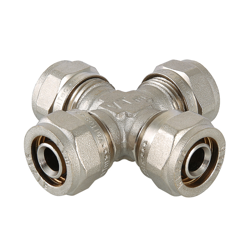 (VTm.341.N) Фитинг обжимной крестовина для присоединения металлополимерных (металлопластиковых) трубопроводов. Предлагаются как равнопроходные модели, так и крестовины с разными диаметрами присоединяемых трубопроводов.