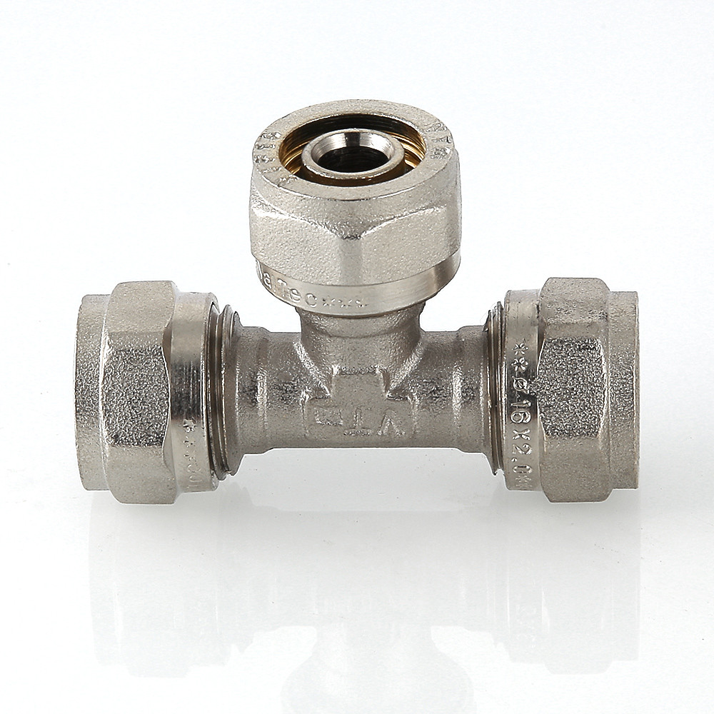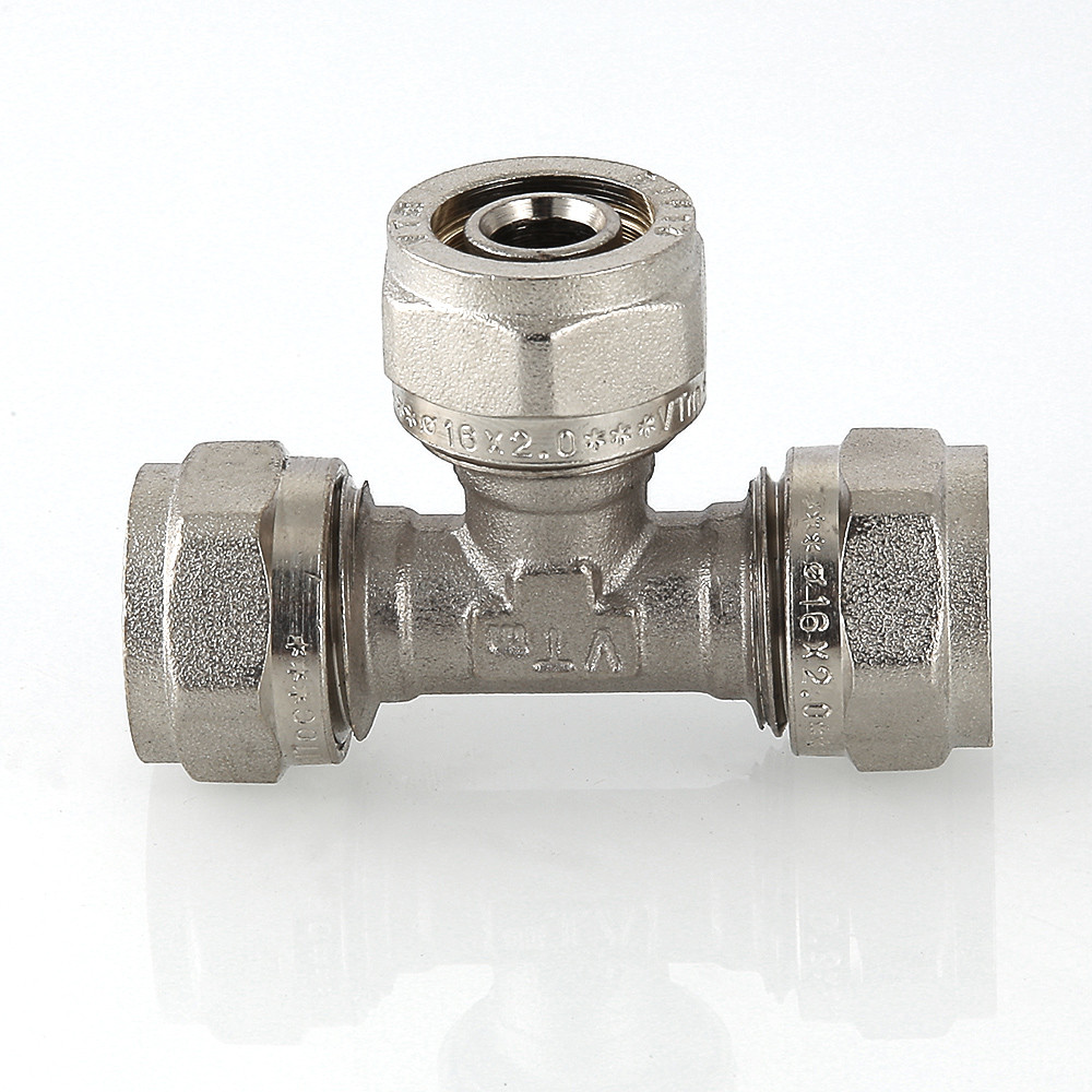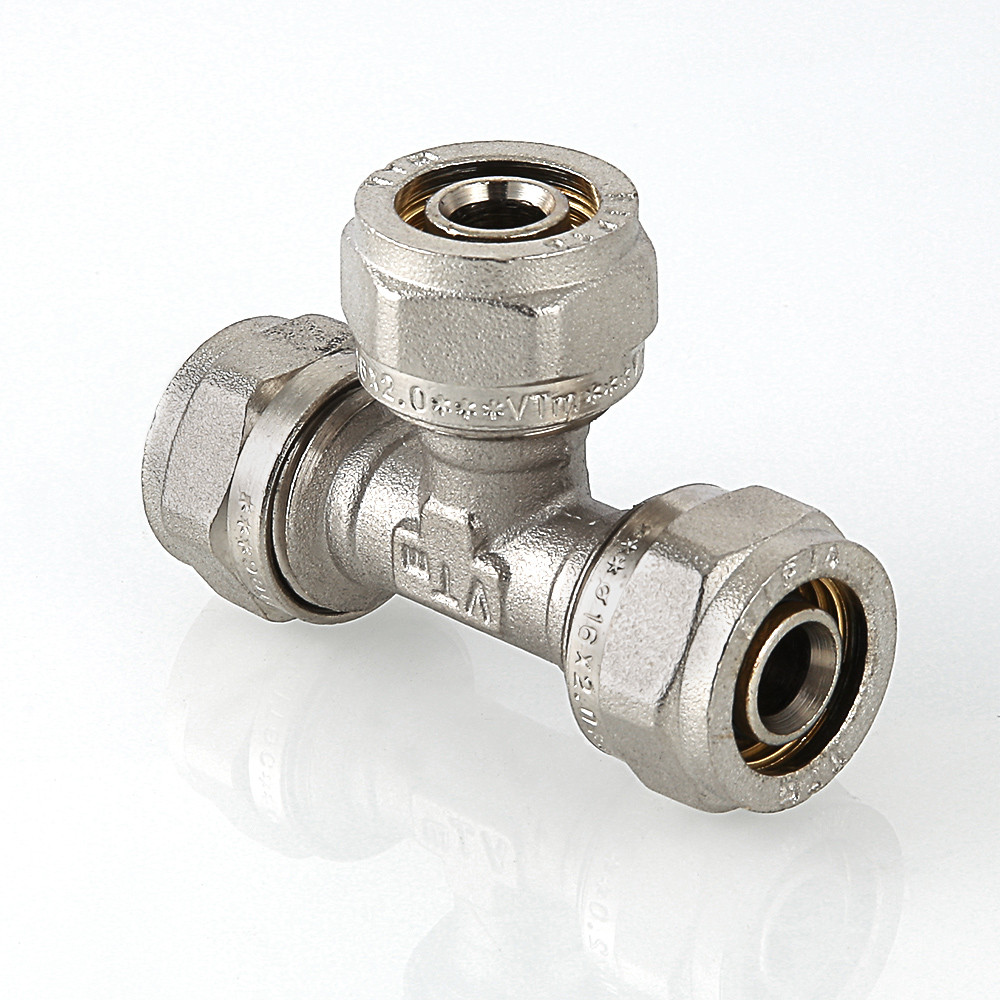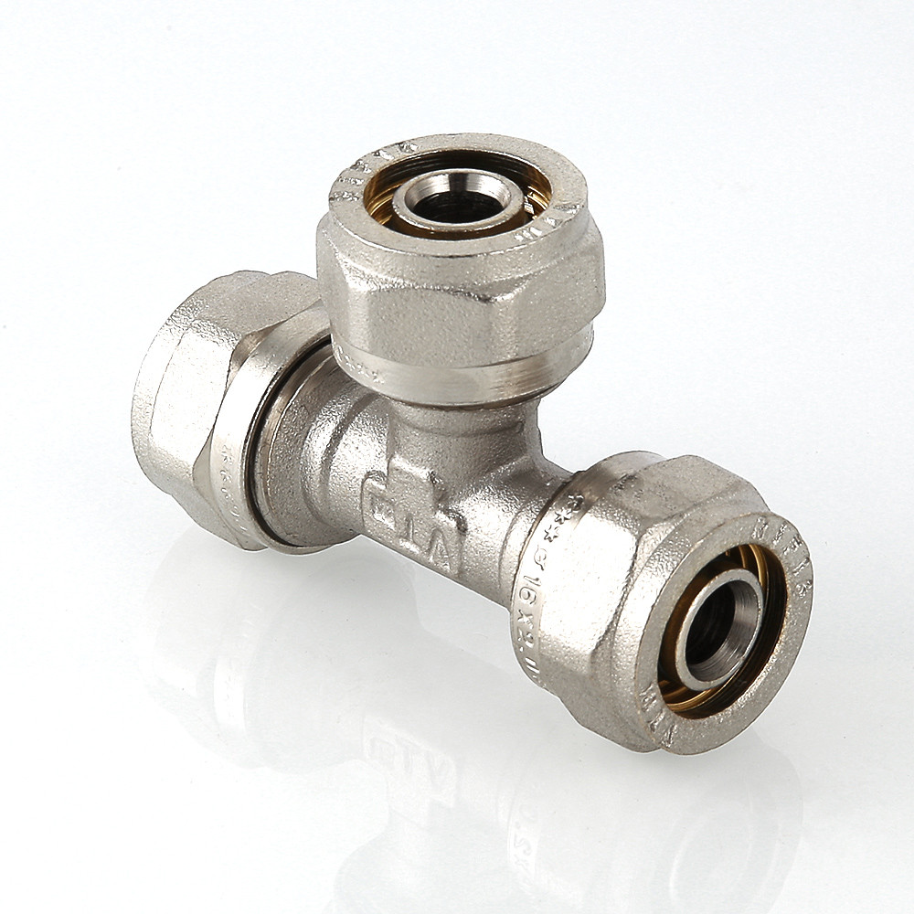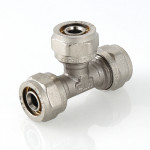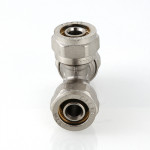 (VTm.331.N) Фитинг обжимной – тройник латунный никелированный для соединения металлопластиковых (металлополимерных) труб. Имеются равнопроходные и переходные модели.