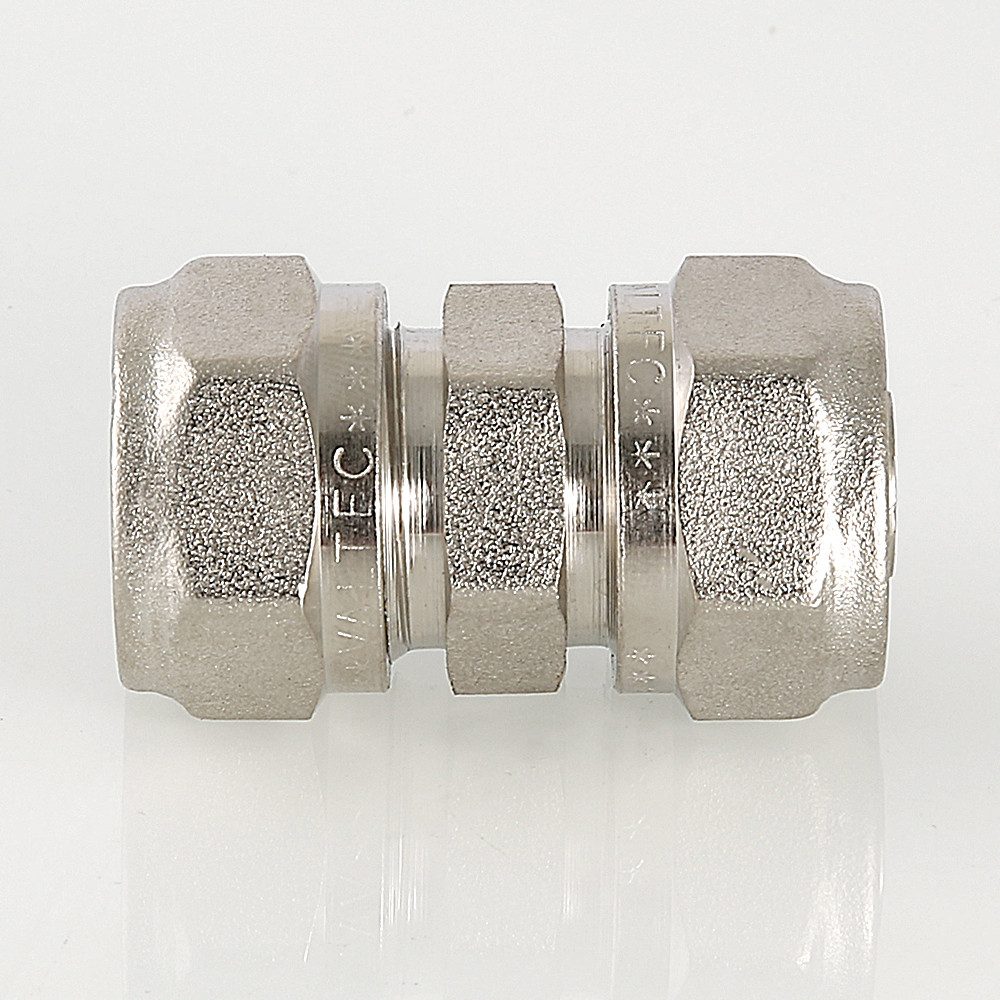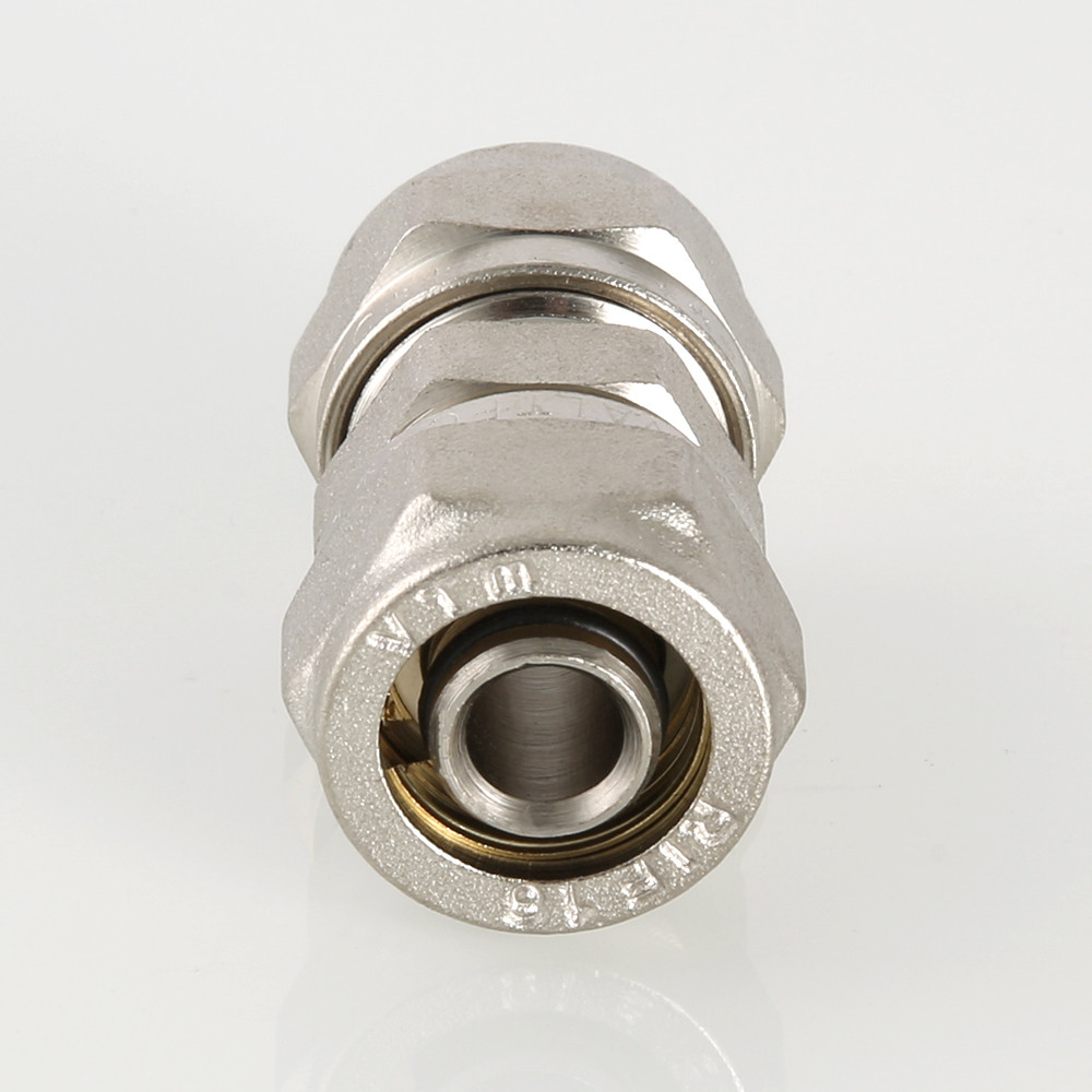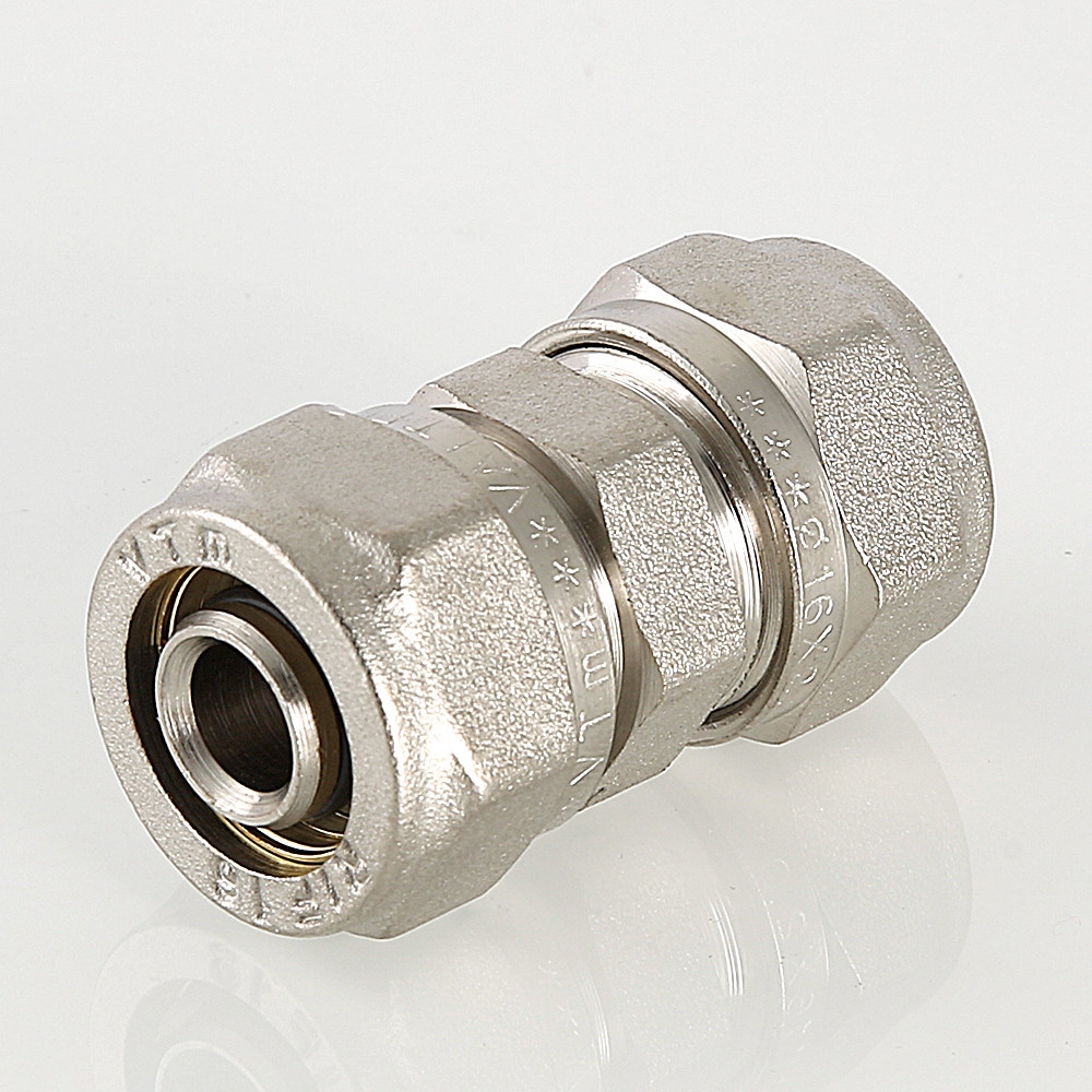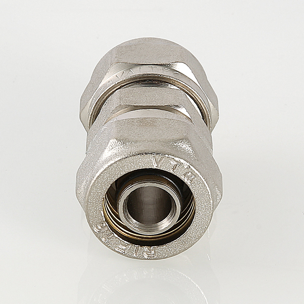(VTm.303.N) Прямой латунный никелированный фитинг для соединения металлополимерных труб. Имеются равнопроходные модели и модели с переходом на другой диаметр.