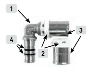 Конструкция пресс-фитинга VALTEC: 1– корпус (латунь CW617N); 2 – обойма (полиэтилен PE-HD); 3 – гильза (нержавеющая сталь AISI 304); 4 – уплотнительные кольца (EPDM Sh70).