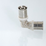 (VTm.251.N) Пресс-фитинг – угольник, обеспечивающий соединение труб (металлопластиковых или из сшитого полиэтилена) под углом 90 градусов. Особенности конструкции изделия, используемые материалы обусловили надежность соединений, повышенную пропускную способность, температурную стойкость, механическую прочность. При изготовлении пресс-угольника используются высококачественные материалы: сантехническая латуни CW617N с никелевым покрытием (корпус), нержавеющая сталь (гильза), EPDM (уплотнительные кольца, 2 шт. для каждого штуцера). Фиксатор, одновременно играющий роль диэлектрической прокладки, делается из нейлона. Монтаж соединителя выполняется пресс-инструментом с насадкой «ТН».