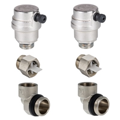 (VT.GPR.41) Комплект автоматических воздухоотводчиков на подающий и обратный коллекторы этажных узлов для поквартирного учета тепловой энергии с перепускным клапаном VT.GPR. Опция, базовые модели узлов укомплектованы ручными воздухоотводчиками. Набор включает в себя воздухоотводчики VT.502.NH.04 (присоединительный размер – 1/2”), отсекающие клапаны VT.539.N.04 (1/2”), коллекторные отводы VTc.531.N.0604 (1" x 1/2") – по 2 ед. каждого изделия.
