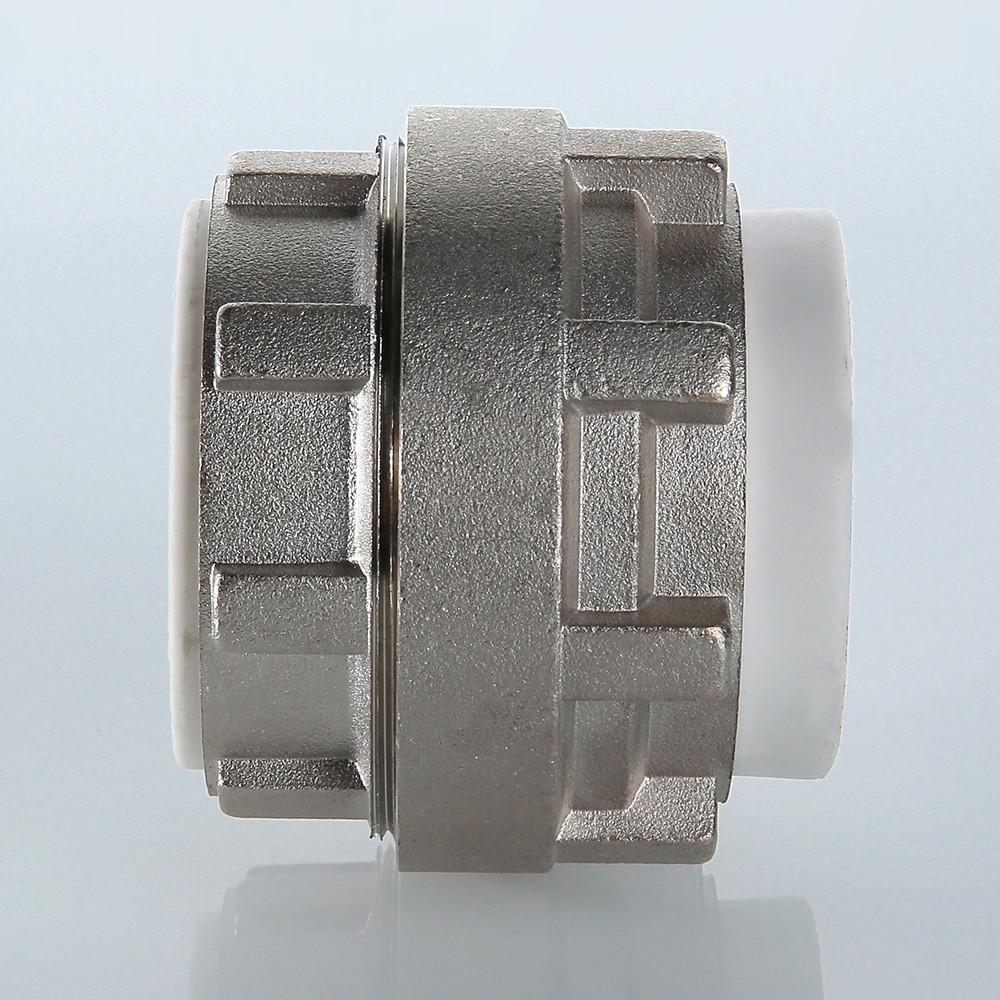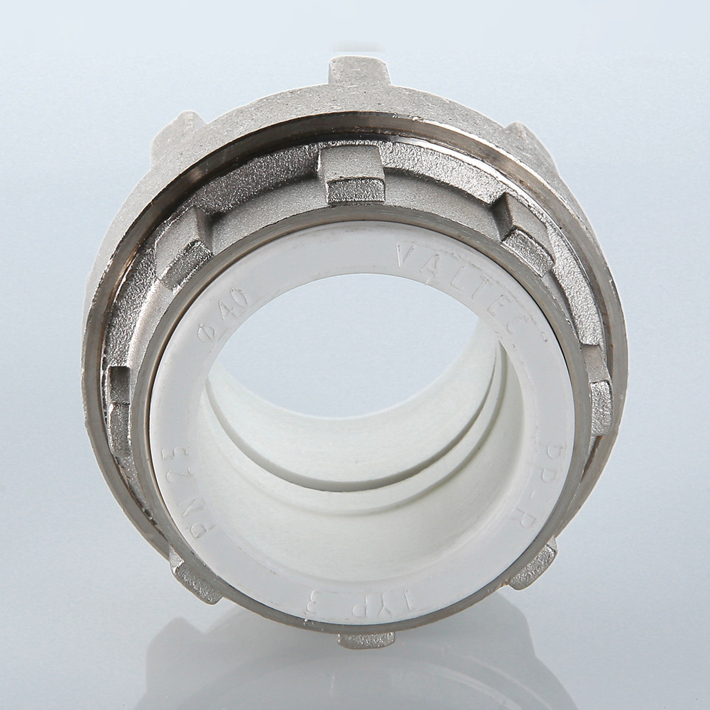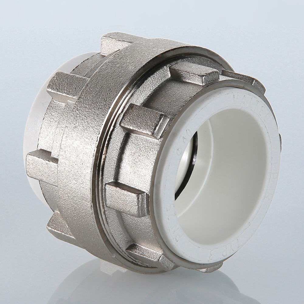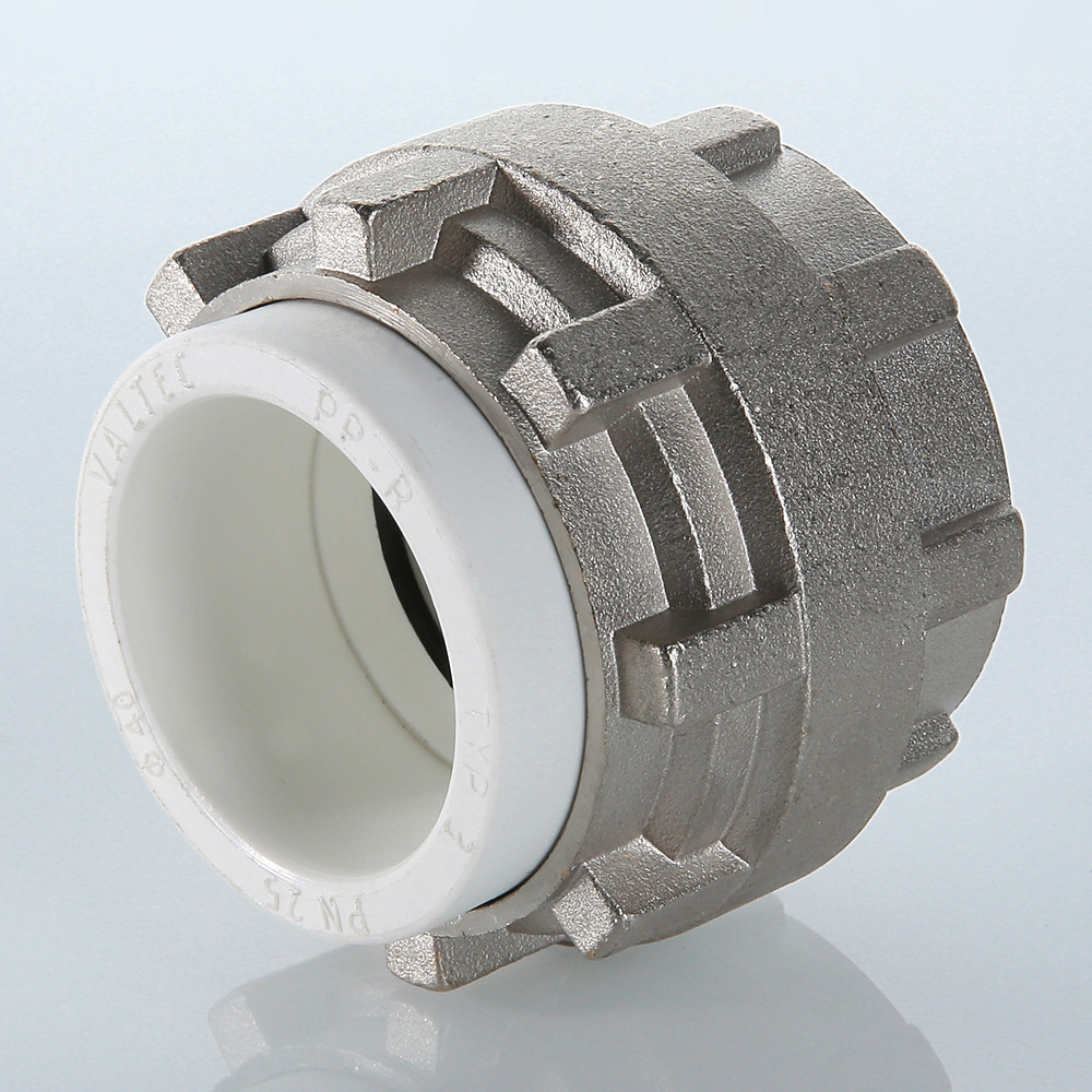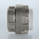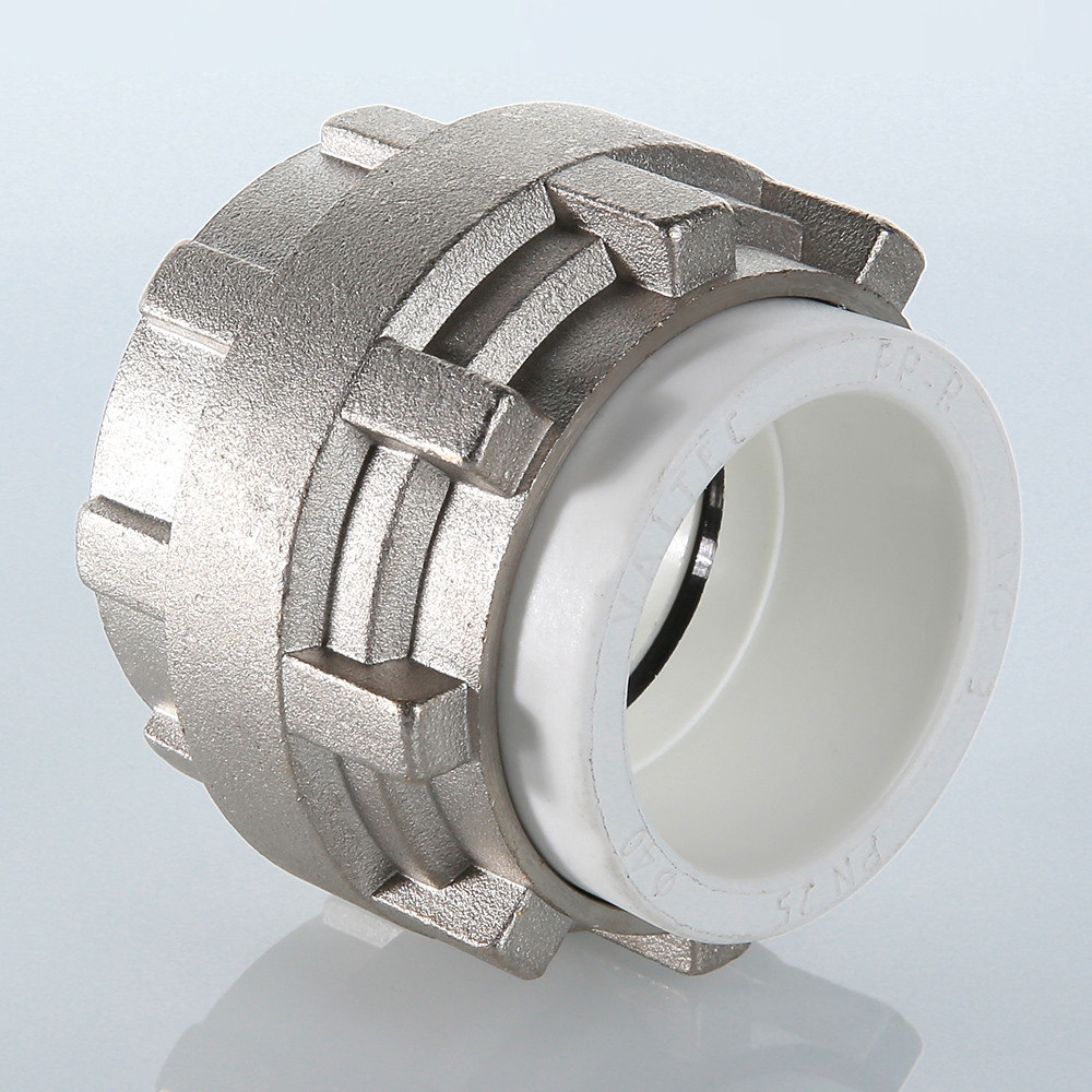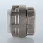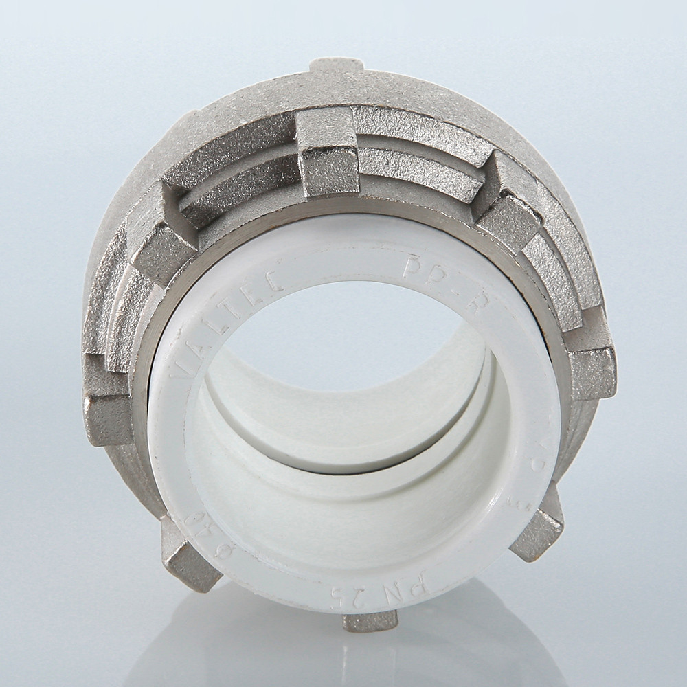 (VTp.763.0) Полипропиленовый фитинг для создания разъемного соединения на полипропиленовом трубопроводе. Соединение частей муфты осуществляется с помощью латунной никелированной накидной гайки. Уплотнительное кольцо выполнено из синтетического каучука EPDM. Монтаж фитинга производится методом раструбной сварки.