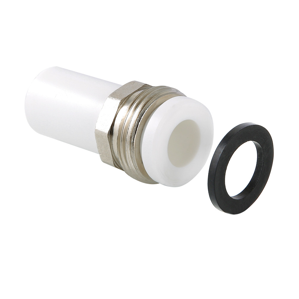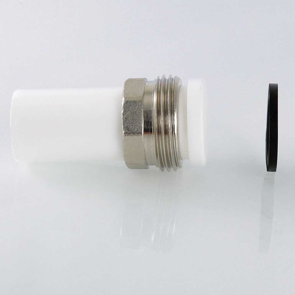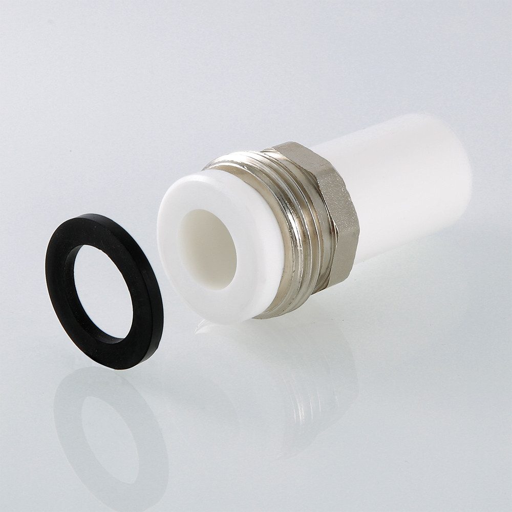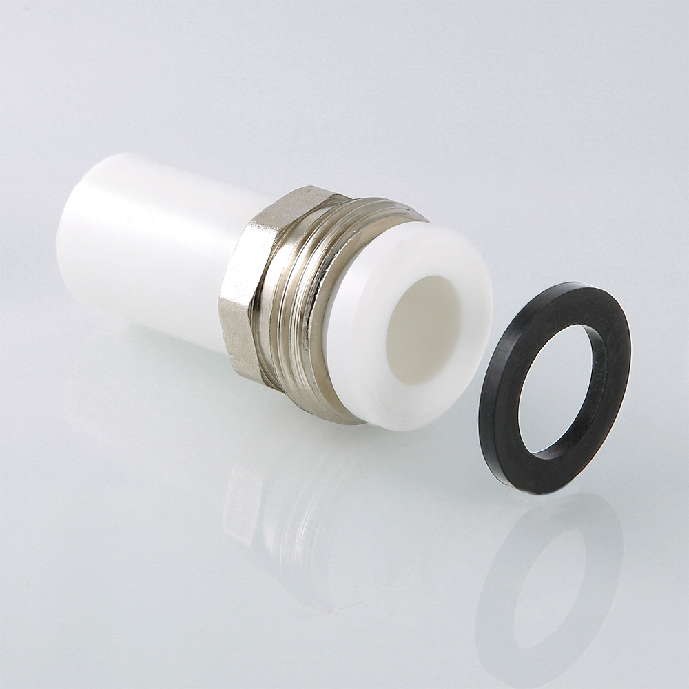 (VTp.721.0) Фитинг для соединения полипропиленового трубопровода и компонента инженерной системы с помощью накидной гайки. Резьба – наружная трубная по ГОСТу 6357.