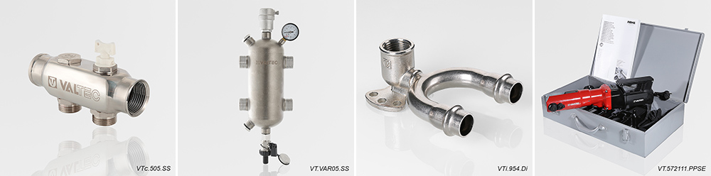 Бренд VALTEC предлагает вашему вниманию модельный ряд труб и фитингов из нержавеющей стали марки AISI 304 типоразмеров от 18 до 54 мм, а также инструмент необходимый для их монтажа.