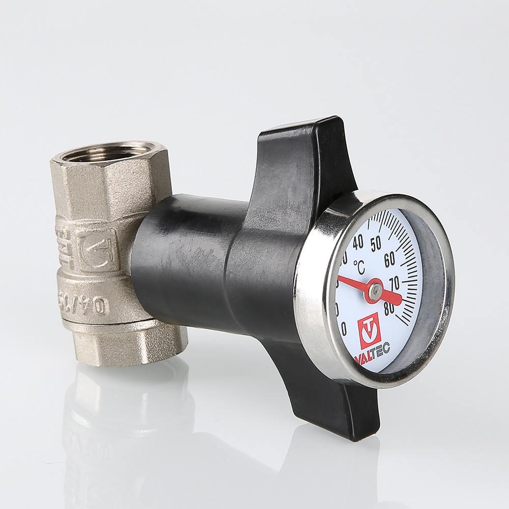 (VT.808.N) Термометр, встроенный в рукоятку управления шарового крана VALTEC BASE VT.808, обеспечивает визуальный контроль температуры рабочей среды в тепловых пунктах, узлах ввода горячей воды, трубопроводах обвязки бойлера и других точках инженерных систем. Термометр соединен с шаровым затвором гильзой из медного сплава, что позволяет измерять температуру с минимальной погрешностью. При необходимости прибор легко извлекается из рукоятки, а его гнездо закрывается заглушкой из ABS-пластика. Из этого же материала выполнена и сама рукоятка крана. Диаметр шкалы термометра – 42 мм, диапазон измерений – 0–80 °С. Резьба присоединения шарового крана с термометром VT.808 – внутренняя.