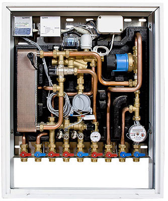 - Осуществлять приготовление горячей воды с помощью встроенного теплообменника (нагрев – от контура отопления) непосредственно перед квартирой. Т.е. при использовании данной станции к дому не надо подводить магистрали горячего водоснабжения. Из наружных и общедомовых подающих сетей достаточно только магистралей отопления и холодного водоснабжения. (В производственной линейке VALTEC есть и модели ИСТВ без этой функции, более бюджетные).