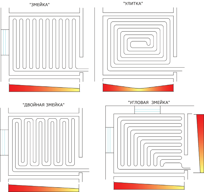 Следует учесть, что шаг петель менее 100 мм трудно осуществить на практике из-за маленького радиуса изгиба трубы, а шаг более 250 мм не рекомендуется, так как возникает ощутимая неравномерность прогрева тёплого пола. Существует несколько способов раскладки петель тёплого пола по помещению (рис. 3). Наиболее предпочтительным вариантом является укладка двойным меандром («улиткой»).