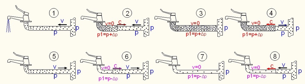 Если, допустим, в квартирный трубопровод поступает горячая вода с температурой 70 °С, а в зоне разрежения гидроудара давление снижается до абсолютного значения 0,3 атм, то в этой зоне вода превратится в пар. Учитывая, что объем пара при нормальных условиях почти в 1200 раз больше объема такой же массы воды, следует ожидать, что данное явление может привести к еще большему росту давления в зоне сжатия ударной волны.