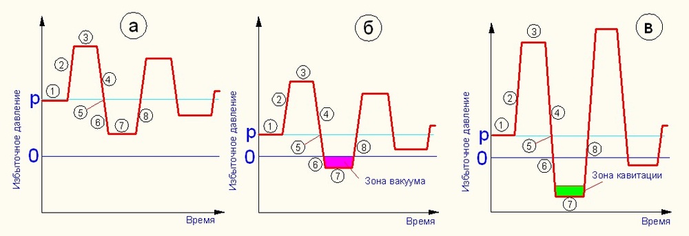 График на рис. 2б отображает ударную волну, зона разряжения которой находится ниже атмосферного давления, но гидравлическая сплошность среды не нарушается. В этом случае давление жидкости в зоне разряжения ниже атмосферного, но эффект кавитации не наблюдается.
