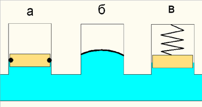 Самым действенным и надежным способом защиты от гидравлического удара является увеличение времени перекрытия потока запорным органом. Именно этот способ используется на магистральных трубопроводах. Плавное закрытие задвижки не вызывает никаких разрушительных возмущений в потоке и позволяет избавиться от необходимости установки громоздких и дорогих демпфирующих устройств. В квартирных системах такой способ не всегда приемлем, т.к. в наш обиход прочно вошли и «однорукие» рычажные смесители, электромагнитные клапаны бытовой техники, и прочая арматура, способная перекрыть поток в короткий промежуток времени. В связи с этим квартирные инженерные системы уже на стадии проекта должны обязательно проектироваться с учетом опасности возникновения гидроудара. Конструктивные мероприятия, такие как использование эластичных вставок, компенсационных петель и расширителей, широкого распространения не получили. Наибольшей популярностью в настоящее время пользуется специально разработанная для этой цели арматура – пневматические (поршневые, рис. 9а, и мембранные, рис. 9б) или пружинные (рис.9в) гасители гидроударов.
