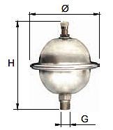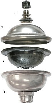 Квартирный гаситель гидроударов VALTEC VT.CAR19 конструктивно состоит (рис. 11) из шаровидного корпуса, выполненного из нержавеющей стали AISI 304L (1), с завальцованной мембраной из EPDM (2). Благодаря небольшим выпуклостям на поверхности мембраны обеспечиваются ее неплотное примыкание к корпусу и максимальная площадь контакта мембраны с транспортируемой средой. Воздушная камера гасителя находится под заводским давлением 3,5 бара, что обеспечивает защиту квартирных трубопроводов, давление в которых не превышает 3 бар. Гаситель может защищать и трубопроводы с рабочим давлением до 10 бар, но в этом случае необходимо с помощью насоса, присоединяемого к ниппелю (3) увеличить давление в воздушной камере до значения 10,5 бара. В случае, когда рабочее давление в квартирной сети ниже 3 бар, рекомендуется через ниппель (3) выпустить часть воздуха из камеры до значения Рраб + 0,5 бар.