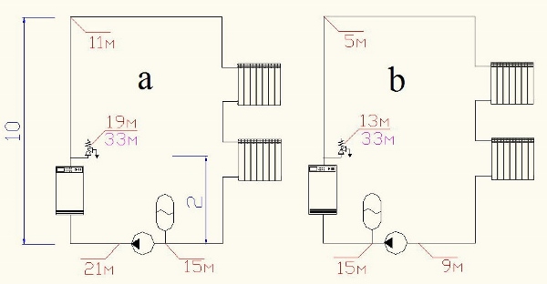 На рис. 1 приведено несколько вариантов присоединения мембранного бака к системе отопления со следующими высотными параметрами: