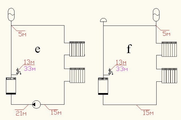 При установке мембранного бака в гравитационной системе отопления на верхней магистрали его следует смещать от главного стояка в сторону отопительных стояков, чтобы исключить паразитное влияние на циркуляцию остывающего в баке теплоносителя. Главный стояк необходимо оснастить воздухоотводчиком и предохранительным клапаном (рис. 1f).