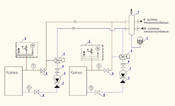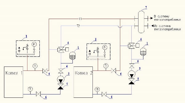 Рис. 5. Установка расширительных баков в системе с несколькими котлами и автоматическим ограничением минимальной температуры воды в обратном трубопроводе (предусмотрено по одному баку на каждый котел): 1 – расширительный бак; 2 – группа безопасности (предохранительный клапан, манометр, воздухоотводчик); 3 – циркуляционный насос; 4 – трехходовой смесительный клапан; 5 – обратный клапан; 6 – запорный кран; 7 – гидравлическая стрелка