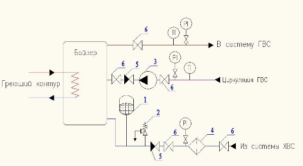 Рис. 7. Установка расширительного бака в системе горячего водоснабжения: 1 – расширительный бак; 2 – предохранительный клапан; 3 – насос; 4 – фильтр; 5 – обратный клапан; 6 – запорный кран