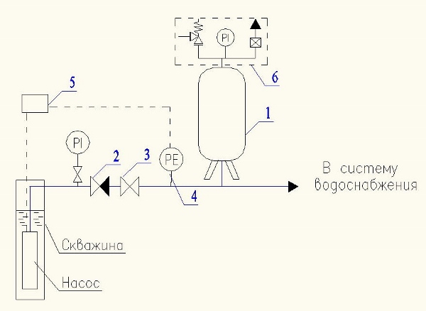 Рис. 8. Пример установки гидроаккумулятора в системе холодного водоснабжения со скважинным насосом: 1 – мембранный бак (гидроаккумулятор), 2 – обратный клапан, 3 – запорный кран, 4 – реле давления, 5 – прибор управления насосом, 6 – группа безопасности (предохранительный клапан, манометр, воздухоотводчик)