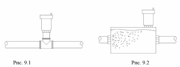 Иногда в публикациях встречаются фраза: «…автоматические воздухоотводчики удалят весь кислород, попавший через стенки трубопровода». Данное утверждение не совсем верно, так как автоматический воздухоотводчик может выпустить кислород только в случае, если он выделится из теплоносителя. Выделение растворенных газов происходит только при резком снижении скорости или давления потока, что в обычных системах редко встречается. Для удаления кислорода устанавливаются специальные проточные деаэраторы, в которых происходит резкое снижение скорости и удаление выделившихся газов. На рис. 9.1 и 9.2 показаны обычный вариант установки воздухоотводчика и вариант с деаэрационной камерой. В первом случае воздухоотводчик удаляет только небольшое количество газов, скопившееся в трубопроводе, во втором – газы, которые принудительно «извлекаются» из потока за счет резкого увеличения сечения и снижения скорости.