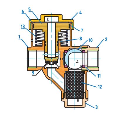 Клапан состоял из большого (1) и малого (2) латунных полукорпусов. В зоне шарового крана (А) располагался латунный хромированный шаровой затвор (10), уплотненный седельными кольцами (11) из тефлона. В зоне фильтровальной камеры, закрытой пробкой (3) находилась фильтрующая сетка с ячейкой 300 мкм (12) из нержавеющей стали AISI 316. Латунный подвижный шток с поршнем (5) имел внутри канал, по которому вода, пройдя золотник (9), поступала в пространство над поршнем (D). Уплотнительные кольца поршня (7), штока (8) и золотник (9) выполнялись из EPDM. Пружинная камера (С), в которой располагалась пружина (13), связывалась с окружающим воздухом через отверстие диаметром 2 мм.