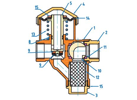 Конструкция шарового крана и фильтра не изменилась. Модернизация коснулась только регулятора давления (рис. 4). Вместо большого поршня, интегрированного со штоком (5), в мембранном редукторе используется эластичная мембрана (14) из армированного EPDM (рис. 5), соединяемая со штоком с помощью прижимного латунного кольца (15). Тем самым исключена из работы сила трения между поршневыми уплотнительными прокладками и корпусом.