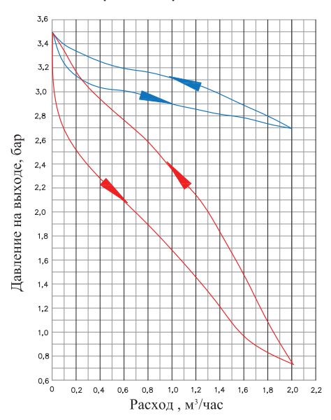 Синим цветом показан график мембранного редуктора, красным – поршневого. Стрелками на графиках показано направление изменение расхода (увеличение и уменьшение).