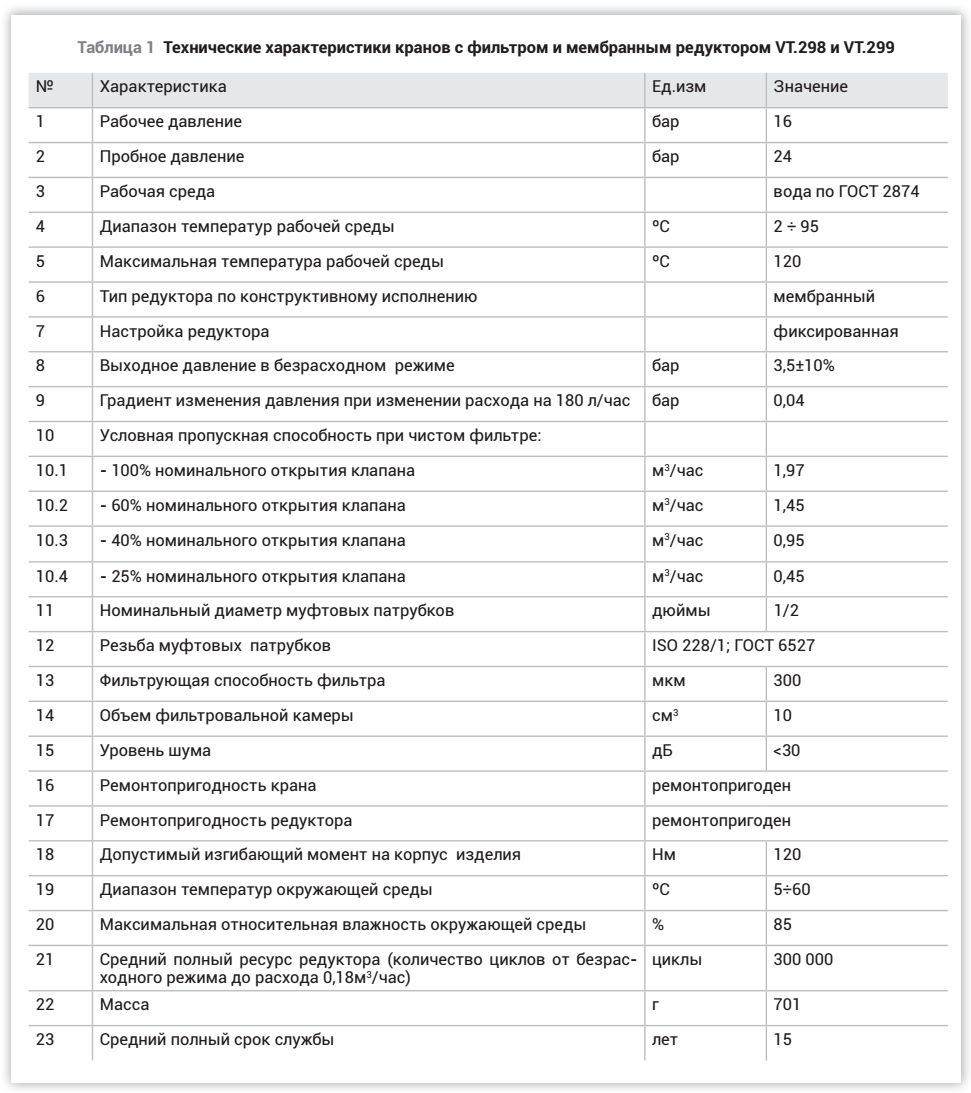 Технические характеристики изделий с мембранным редуктором VT.298 и VT.299 приведены в таблице 1.
